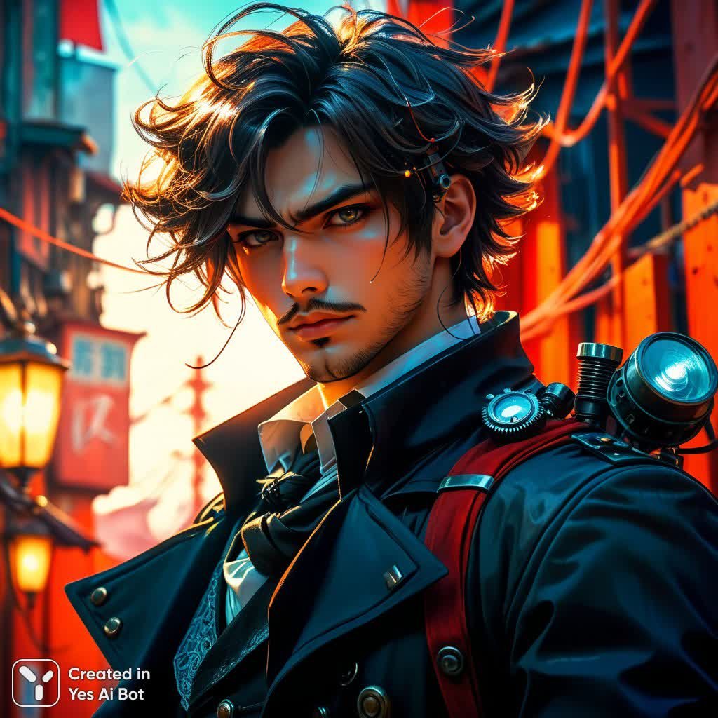 Мрачный и захватывающий образ мужчины в стиле стимпанк, воплощенный в ярком акварельно-акриловом этюде. Смелая композиция с ракурсом снизу вверх подчеркивает силуэт персонажа, погруженного в атмосферу индустриальной меланхолии. Его волнистые волосы контрастируют с массивными механическими деталями и запчастями, пронизывающими его тело сложной сетью проводов. Лицо освещено резким солнечным светом, создающим игру света и тени, где глубокие тени переходят в холодные оттенки, добавляя драматизма. Использование техники скетча в стиле манхвы придает изображению динамику и экспрессию, а мелкие линии и сверкающие частички пыли оживляют сцену. Яркий красный фон создает мощный визуальный контраст, акцентируя внимание на деталях и усиливая общую мрачность эстетики. Этот персонаж – воплощение грубой мощи и технологического прогресса, заключенное в рамки художественного видения, где сочетаются реализм и фантазия. Он словно сошел со страниц комикса или иллюстрации к альтернативной истории, полной загадок и опасностей. Это не просто портрет, это история, рассказанная языком цвета и формы, вызывающая ощущение таинственности и предчувствия надвигающейся бури в мире механизмов и шестеренок. Каждая деталь продумана до мелочей, создавая уникальный и запоминающийся образ