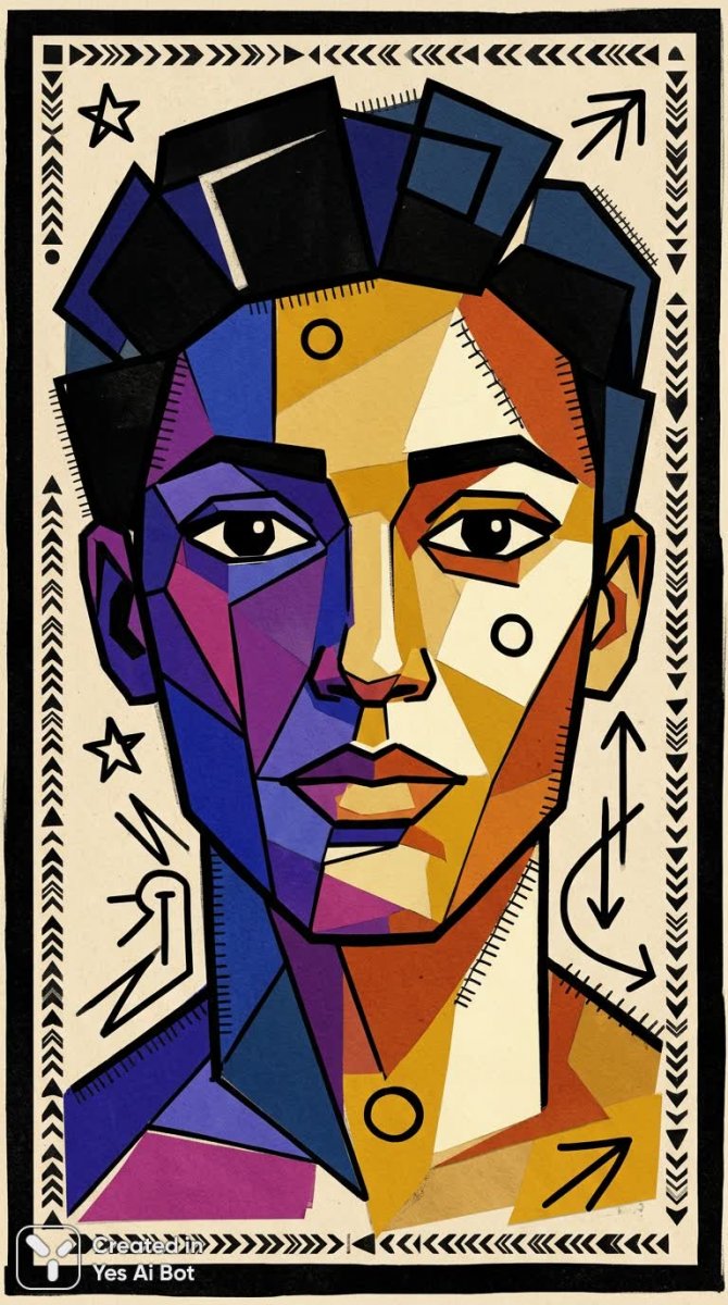 Смелое портретное изображение в ярких цветах, выполненное в технике геометрической коллажа. Черные, толстые линии и схематичные элементы создают ощущение лаконичности и простоты. Иконки гармонично дополняют композицию, а полигональное разбиение лица добавляет динамики и оригинальности. Преобладание сине-фиолетовой палитры подчеркивает глубину и загадочность образа. Художественный стиль представляет собой декоративное сочетание двойственности и прозрачных фрагментов, создающих эффект направленного движения как бы пограничного следа или последовательности абстрактных арб. Это визуальное исследование формы и цвета, где каждый элемент тщательно продуман для достижения максимального эффекта. Композиция демонстрирует игру света и тени, подчеркивая текстуру и объемность изображения. Работа выполнена в современном стиле с использованием инновационных техник коллажа, что придает ей уникальность и неповторимость. Портрет излучает уверенность и силу, воплощая идею о гармонии между геометрией и человеческой формой. Он представляет собой захватывающее сочетание абстракции и реализма, предлагая зрителю задуматься о природе восприятия и красоте простоты. Использование ярких цветов и смелых линий делает это изображение запоминающимся и впечатляющим. Это произведение искусства, которое привлекает внимание своей оригинальностью и глубиной