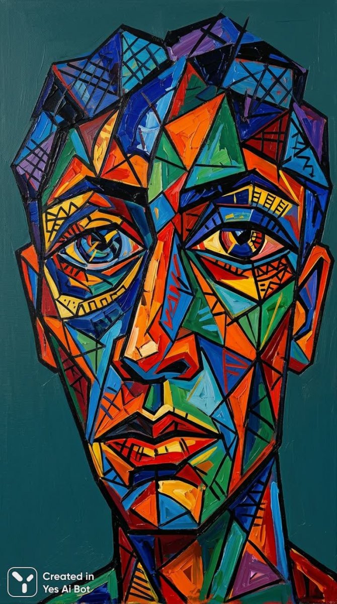 Кубизм и эмоции: яркое лицо в геометрических формах - Картинка, созданная ИИ NanoBanana