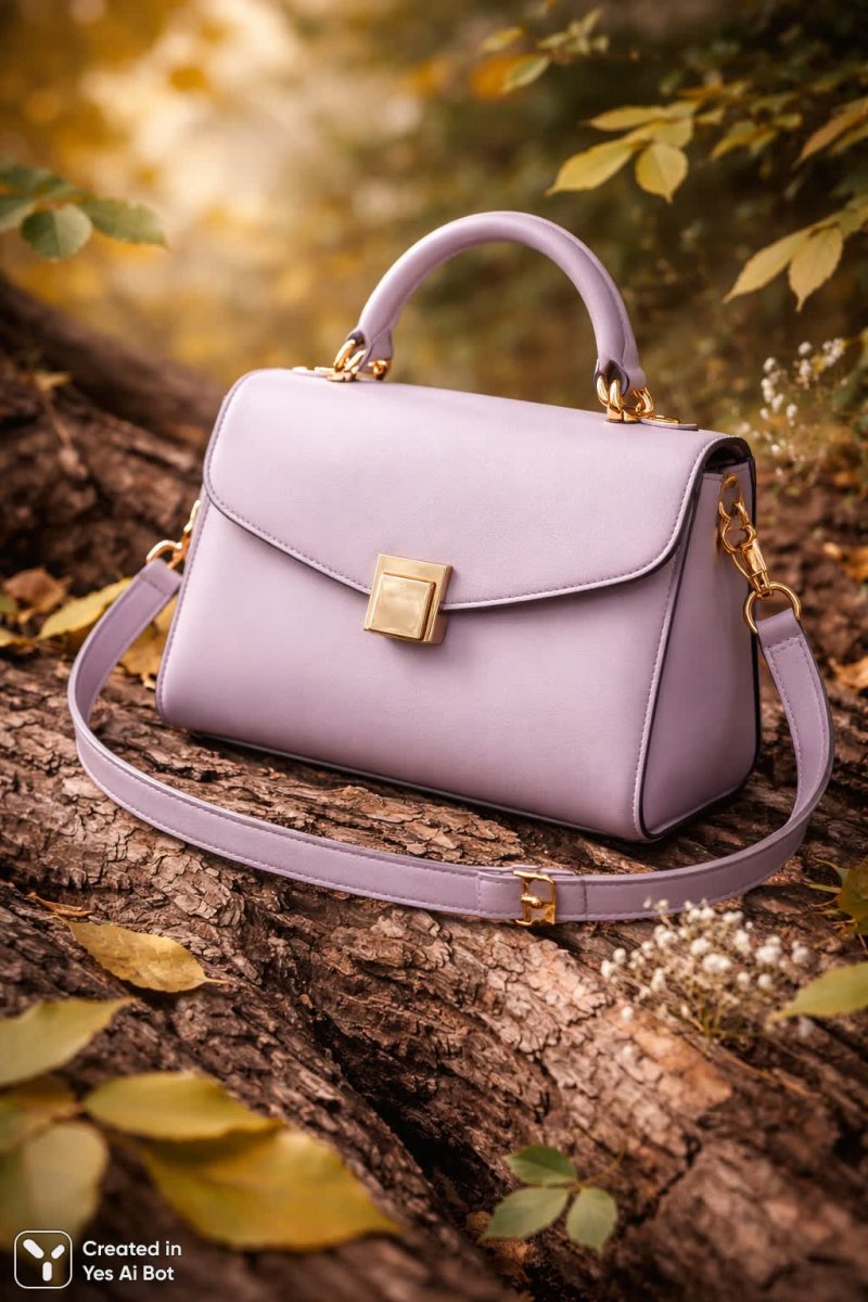 matte lilac handbag on brown bark, rustic contrast superb shots with lightly sprinkling foliage around, delightful interpretation consistent, spontaneous style integration, tasteful glow angles, product exposure news style.