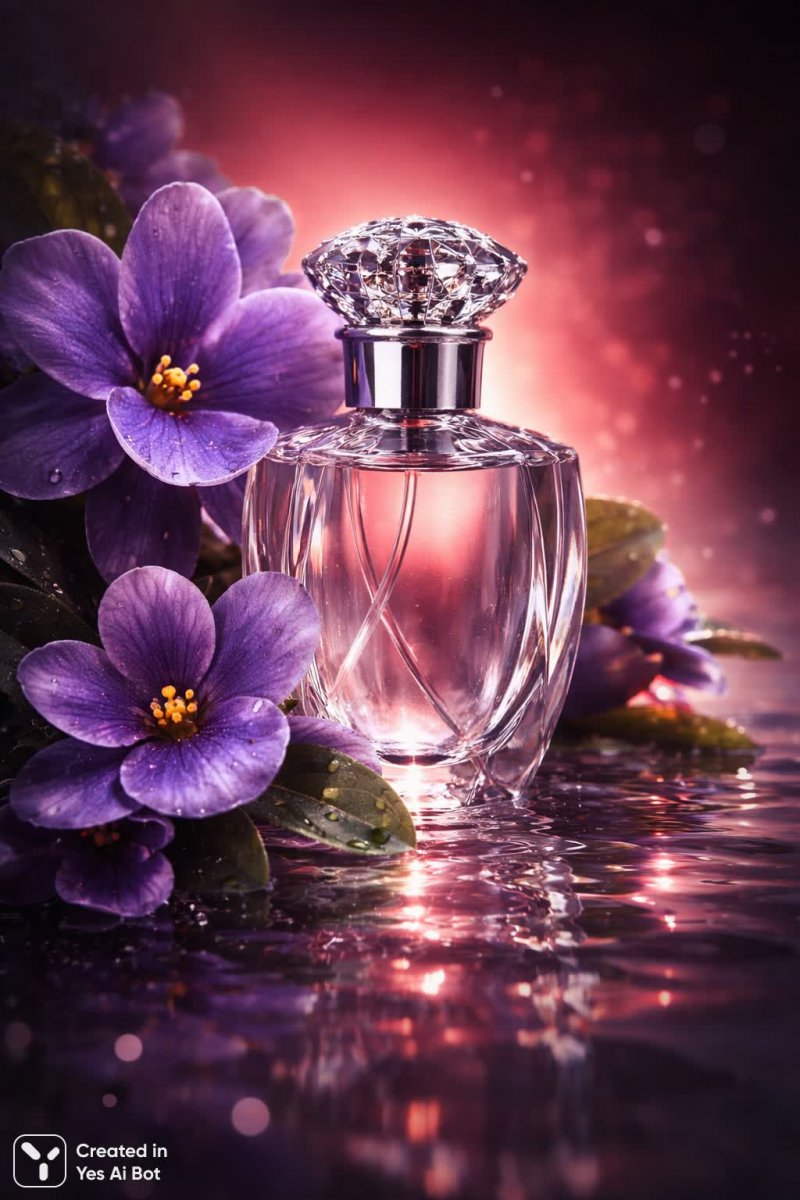 clear crystal bottle with silver cap, slight gradient of glowing red light behind, large violets wrapping around near water surface, elegant flow, dazzled reflections, deception of depth, lifestyle advertisement style.