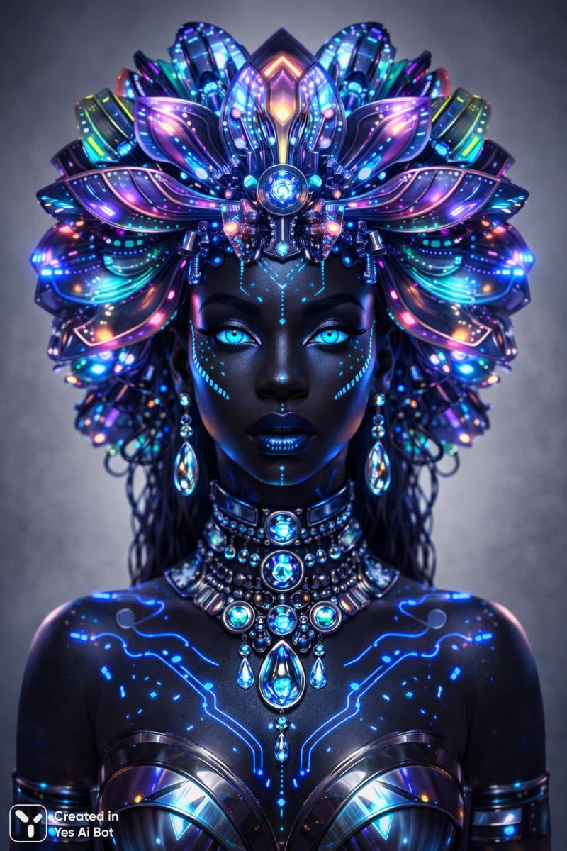 Встречайте королеву шаманов будущего – воплощение гармонии технологий и древних духовных традиций. Ее скульптурный портрет, выполненный с поразительной симметрией, демонстрирует глубокий черный цвет кожи, украшенный светящимися синими узорами, словно карта звездного неба или схема сложного биокода. Массивная диадема из цветов – не просто украшение, а переплетение высокотехнологичных интерфейсов и неоновых оттенков, создающее ощущение живой, пульсирующей энергии. Отражающие драгоценности подчеркивают ее царственный статус и усиливают загадочность образа. Ее взгляд завораживает своей глубиной и гипнотическим притяжением, словно она видит сквозь время и пространство, соединяя прошлое, настоящее и будущее. Мягкий серый фон служит идеальным фоном для этого фантастического существа, позволяя деталям ее внешности сиять во всей красе. Ультрадетализация и яркая визуализация передают сюрреалистичную сущность биопанка – жанра, где природа переплетается с кибернетикой, а органическое сливается с искусственным. Этот образ – символ новой эры, где мудрость предков сочетается с возможностями будущего, создавая уникальный и неповторимый мир духовности и технологий. Она – хранительница равновесия между древними знаниями и инновационными открытиями, королева, способная управлять энергией космоса и гармонизировать биосферу. Ее присутствие вызывает благоговейный трепет и заставляет задуматься о границах возможного в мире будущего