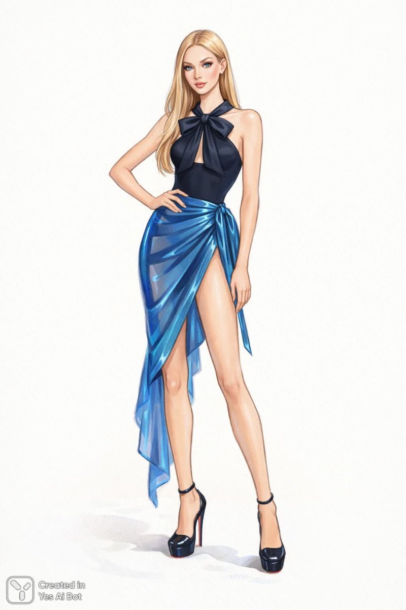 Элегантная и утонченная мода воплощена в этой реалистичной иллюстрации. Высокая стройная женщина с длинными ногами демонстрирует безупречный стиль. Ее изящное лицо обрамлено гладкими светлыми волосами, зачесанными назад, а макияж подчеркивает ее выразительные черты. Черный топ на бретельках с большим бантом у горловины приковывает внимание, гармонично сочетаясь с синим блестящим асимметричным саронг с высоким разрезом. Акцент на ногах делает образ еще более соблазнительным: черные высокие чулки и туфли на высоком платформе с красными подошвами добавляют дерзости и уверенности. Женщина грациозно позирует, опираясь рукой на бедро, демонстрируя идеальную осанку и изящество движений. Белый фон подчеркивает чистоту линий и акцентирует внимание на деталях образа. Мягкое освещение создает атмосферу роскоши и утонченности, а четкая фокусировка позволяет рассмотреть каждую мелочь – от текстуры ткани до блеска обуви. Это произведение искусства является настоящим гимном современной моды, сочетающим в себе элегантность, смелость и женственность. Иллюстрация передает ощущение уверенности и силы, воплощая идеал стиля и красоты для современных женщин, которые ценят индивидуальность и стремятся к совершенству во всем. Вся композиция пронизана атмосферой гламура и роскоши, делая ее идеальным образцом для вдохновения в мире моды и дизайна
