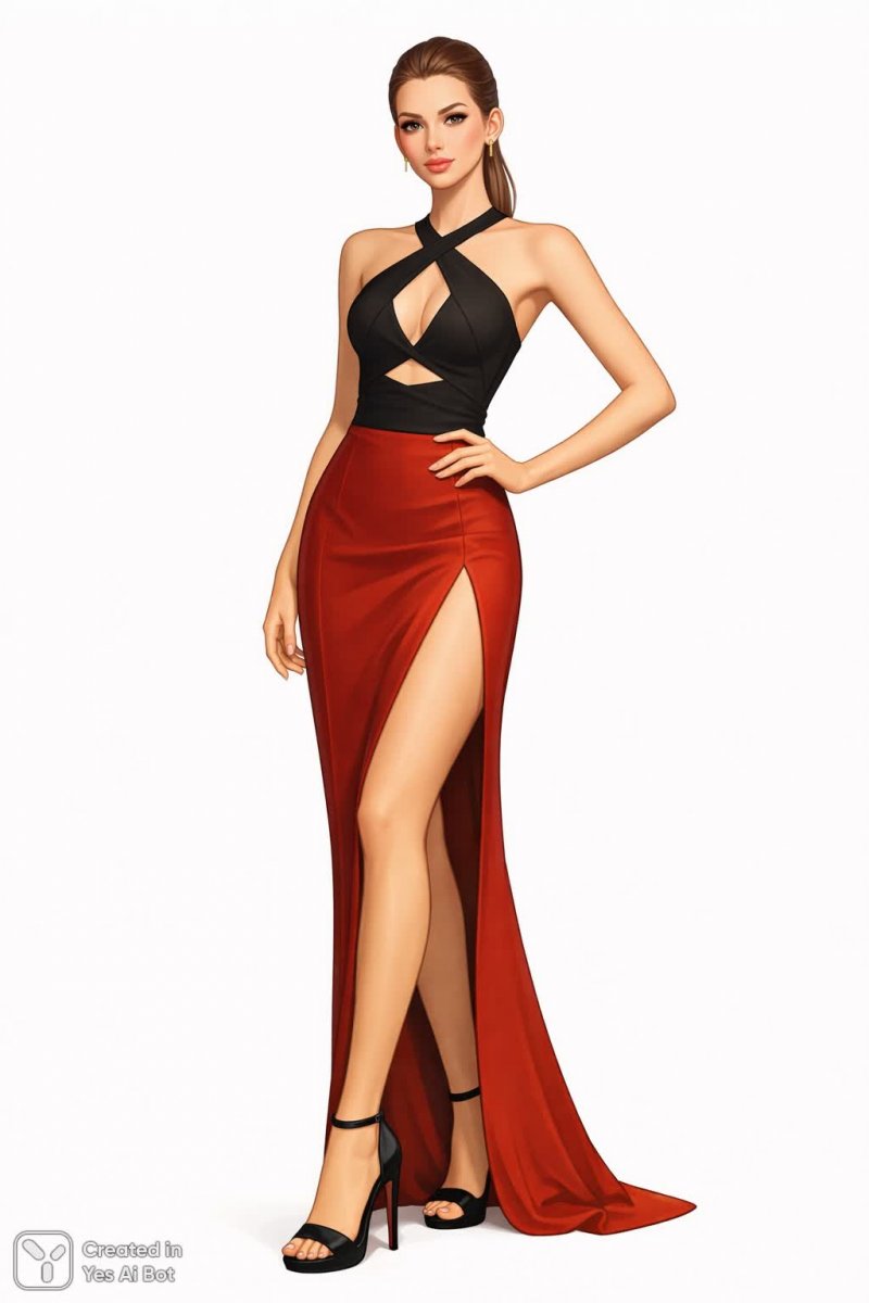 tall slender woman with long legs, straight posture, light brown slicked-back hair, expressive facial features, long red lace skirt with high side slit, sheer fabric, form-fitting silhouette, black halter top with deep v-neck and criss-cross cutout design, black peep-toe stiletto heels, confident pose, one hand on hip, other resting on thigh, ultra high resolution, fashion editorial illustration, soft studio lighting, bg white.