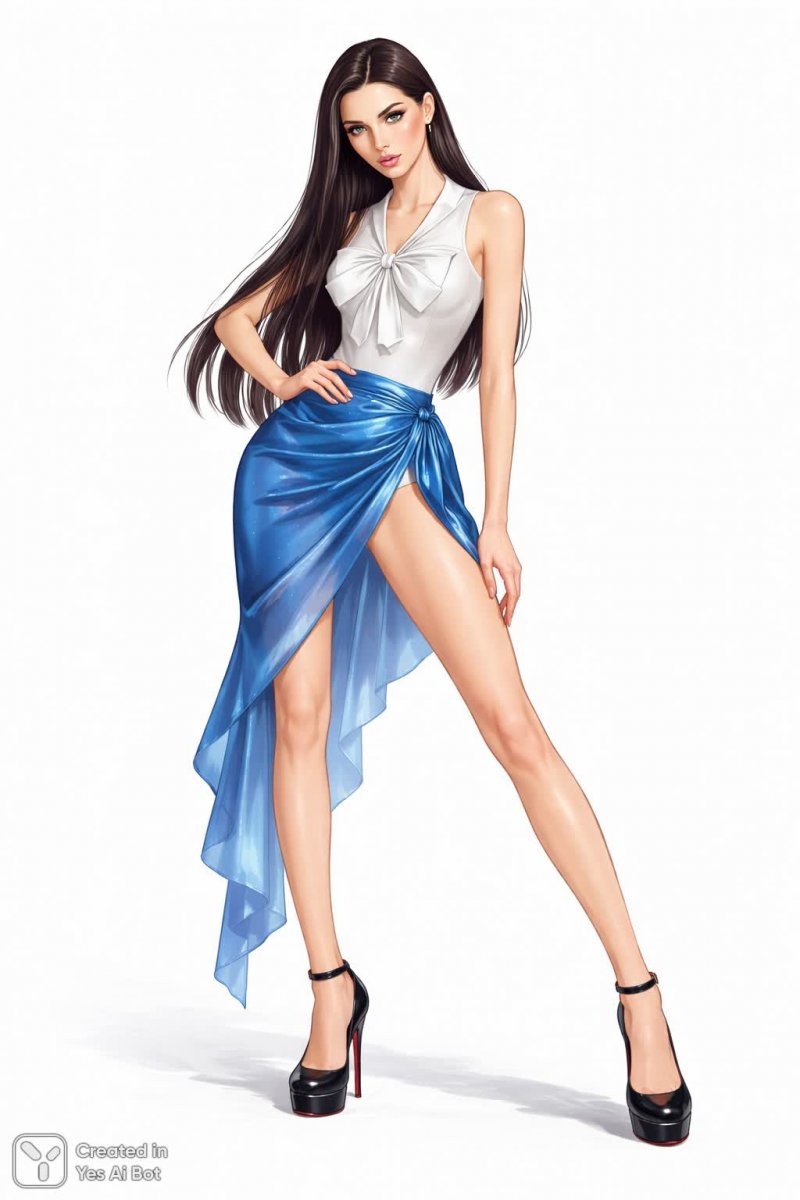Элегантная и утонченная иллюстрация моды представляет собой изящную девушку с невероятно длинными ногами и четкими чертами лица, подчеркнутыми гладкой темной прядью волос, зачесанной назад. Ее образ дополнен облегающей белой блузкой с большим бантом у горловины, создающим ощущение нежной женственности. Ярким акцентом является небесно-голубая блестящая асимметричная юбка-саронг с разрезом, который открывает длинные стройные ноги и добавляет динамики в композицию. Высокие шлепанцы на платформе черного цвета придают образу смелость и современность. Взгляд девушки пронзительный и сосредоточенный, она держит одну руку на бедре, а другую – на талии, создавая эффект уверенности и соблазна. Стиль иллюстрации напоминает цифровой рисунок с невероятной детализацией, выполненный при ярком освещении. Фон представляет собой однотонное белое полотно, которое позволяет полностью сосредоточиться на модели и ее образе. Ракурс съемки – на уровне глаз, что создает ощущение личного контакта со зрителем и усиливает эмоциональное воздействие картины. Эта работа – воплощение современной моды и элегантности, выполненная с безупречной точностью и вниманием к каждой детали, демонстрирующая мастерство цифрового художника и его умение передавать красоту и стиль через визуальные образы. Иллюстрация излучает уверенность, изысканность и неповторимый шарм