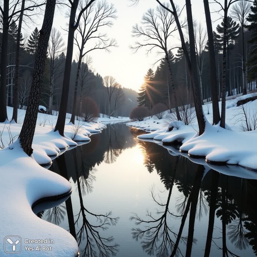 Завораживающий зимний пейзаж пленяет своей тихой красотой и спокойствием. Частично замерзшая водная гладь обрамлена плавными волнами снежных сугробов создавая ощущение умиротворения и гармонии с природой. Спокойная поверхность воды отражает голые ветви деревьев, населяющих окружающий лес – четкие и детализированные отражения формируют симметричный визуальный отголосок растительности. Небольшие островки на воде покрыты мягкими заснеженными холмами добавляя пейзажу ощущение сказочности и нереальности. Преобладающая цветовая гамма состоит из холодных синих оттенков и нежной белизны снега и воды, контрастирующих с приглушенными коричневыми и серыми тонами стволов и ветвей деревьев. Небо сквозь кроны деревьев окрашено в бледно-желтый цвет намекая на рассвет или закат, создавая мягкое рассеянное освещение. Композиция выдержана в равновесии отражающая вода служит центральным элементом притягивающим взгляд зрителя в глубину зимнего леса. Атмосфера пронизана тишиной и созерцательностью вызывая чувство уединенности и подчеркивая суровую красоту зимы. Стиль изображения реалистичен с элементами живописи акцент сделан на гладких текстурах и тонких переходах света и тени. Ракурс находится на уровне глаз погружая зрителя в мир этой безмятежной зимней сцены передающей ощущение спокойствия и единения с природой. Это картина, способная унести вас в мир тишины и покоя где время замирает