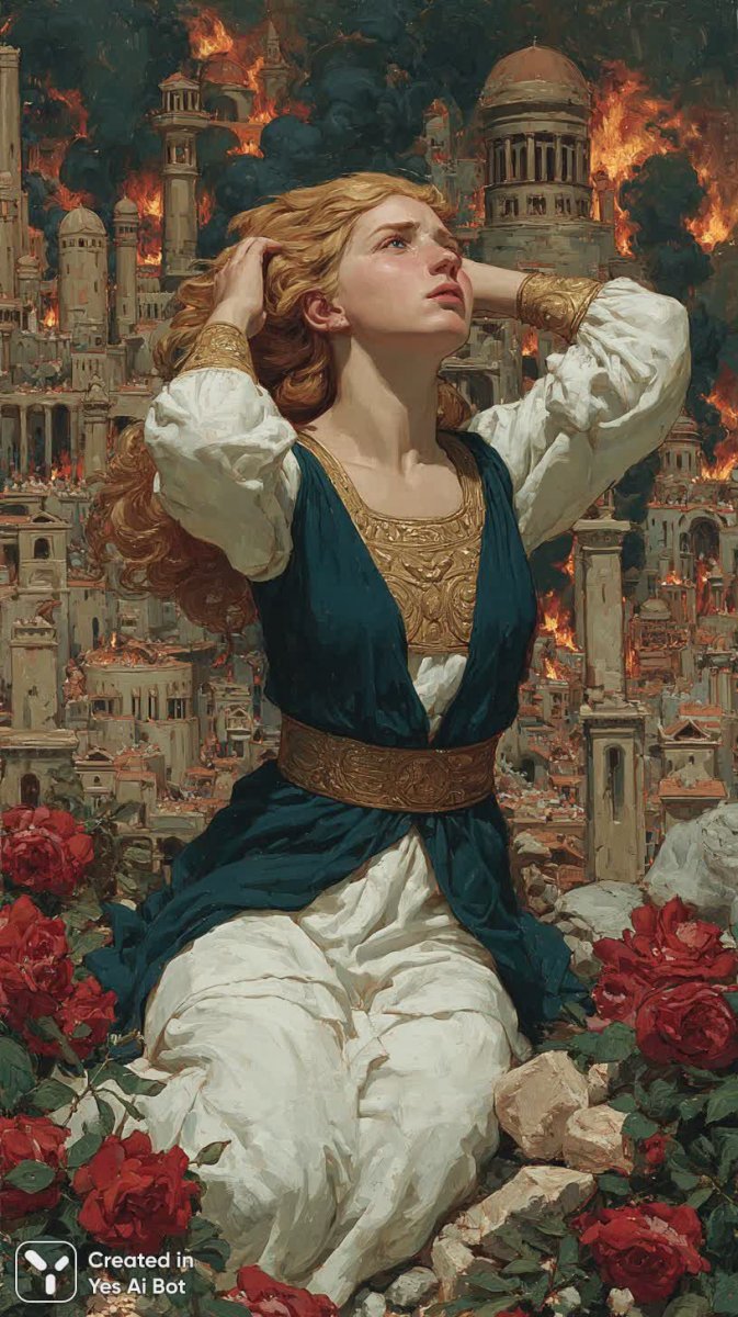 A beautiful young woman with long, loose, fiery red hair and fair skin stands on a rocky terrain surrounded by lush red and pink roses and looks upset. She's wearing an airy Greek-style dress.: A flowing navy blue upper tunic with gold trim that falls elegantly to reveal a white lower tunic. Her hands are raised, palms clutching strands of her own hair, a gesture of suffering. Behind her, the city is burning brightly, engulfed in flames, orange and yellow flames licking stone towers and arched bridges over the river. The sky is a dramatic mix of smoky gray clouds with shades of sunset. The composition is a full-length vertical portrait that h...