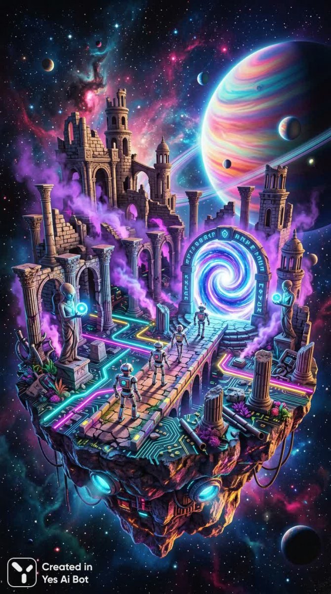 Затерянный в космической бездне остров руин, сотканный из неземной реальности и разрушенного величия. Здесь, среди парящих обломков замка с колоннами и осыпающимися платформами, простирается причудливый ландшафт, напоминающий печатную плату, окутанный таинственным фиолетовым дымом. Вдали возвышается огромная красочная планета, а вокруг неё клубится чернильная космическая туманность, создавая завораживающий фон для этого фантастического места. Среди руин возвышаются древние статуи, бережно удерживающие в своих руках светящиеся сферы – свидетельства ушедшей цивилизации и хранители забытых знаний. По каменному мосту, пронизывающему этот сюрреалистический пейзаж, неспешно движутся хромированные роботы, направляясь к мерцающему порталу, словно патрулируя границы между мирами или готовясь к новому путешествию в неизведанное. Каждая деталь этой невероятной сцены выполнена с потрясающей точностью и детализацией – это гиперреалистичная цифровая коллаж в высоком разрешении, способный перенести зрителя в мир фантастических грёз и космических тайн. Ощущение погружения усиливается благодаря тщательно проработанным текстурам камня, металла и энергии, а также насыщенности цветовой палитры, которая создает атмосферу загадочности и величия. Это визуальное произведение искусства – захватывающее сочетание научной фантастики и мифологии, приглашающее задуматься о природе реальности и возможностях будущего