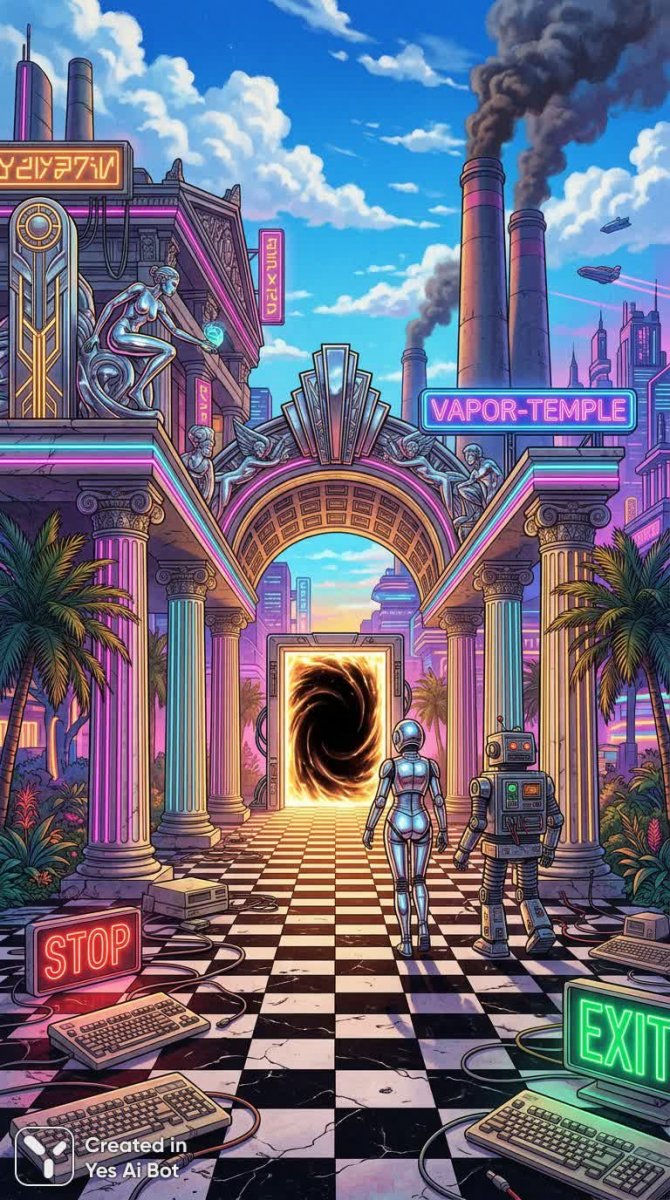 Завораживающая сцена в стиле вейпорвейв переносит зрителя в необычное пространство, где античная архитектура и футуристические элементы сливаются воедино. Величественные греческие колонны гармонично сочетаются с изящными скульптурами в духе ар-деко, создавая ощущение монументальности и утонченности. Экзотические пальмы добавляют тропический колорит этой сюрреалистичной композиции. В центре внимания – фигуры, облаченные в серебристые хромированные костюмы, наряду с бесшовными роботами, которые словно оживают в этом дивном мире. Под ногами простирается шахматный пол, плавно перетекающий в безбрежное голубое небо, усыпанное белоснежными облаками. В конце арки зияет зловещий черный портал, манящий и пугающий одновременно. Вдали виднеются огромные дымящиеся трубы, напоминающие о промышленном прошлом этого места, а разбросанные повсюду ретро-компьютерные клавиатуры добавляют атмосферу ностальгии по ушедшей эпохе. Яркие неоновые вывески с надписями 'стоп' и 'выход' создают контраст с общей палитрой, придавая сцене динамизм и тревогу. Вся картина пронизана пульсирующими неоновыми цветами, которые усиливают ощущение нереальности происходящего и погружают зрителя в мир грез и фантазий, где прошлое и будущее переплетаются в удивительной гармонии. Это визуальное путешествие в альтернативную реальность, наполненную загадками и тайнами, где каждый элемент имеет свой смысл и значение
