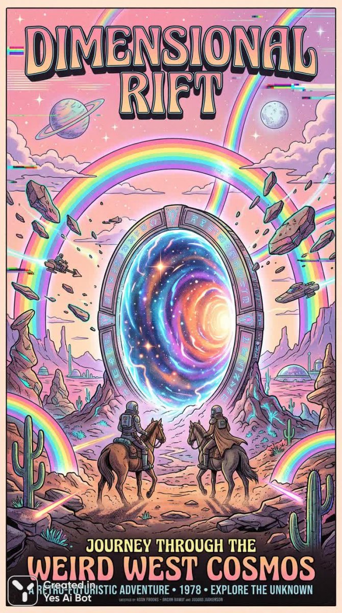 surreal landscape with rainbow arches and floating rocks, an open portal to another dimension at the center, monochrome elements with pastel pink sky and iridescent holographic foil highlights, 70s retro poster, weird west meets sci-fi, dreamy mood, hyper-realistic pop, glitch aesthetic.