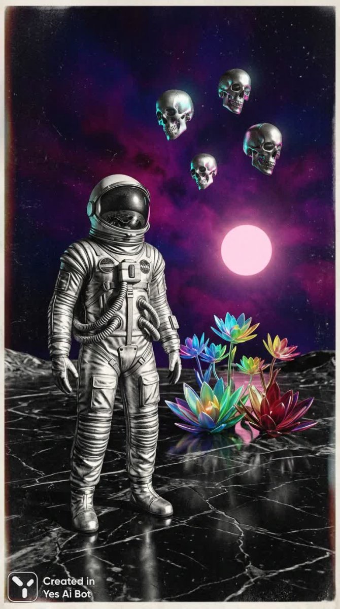 На изображении, выполненном в стиле ретрофутуризма, представлен мужчина на лунной поверхности под нежно-розовым солнцем и необычным неоново-фиолетово-розовым небом. Черно-белая основа изображения контрастирует с яркими деталями: парящими серебряными черепами, черным мраморным грунтом под ногами героя и радужными цветами на заднем плане. Работа сочетает в себе элементы светотеневого рисунка (кьяроскуро) и гиперреализма, создавая ощущение глубины и высокой детализации. Влияние творчества Ноны Лиммен проявляется в сюрреалистичных глитч-эффектах, характерных для эстетики глитчкора, а присутствие элементов 'странного запада' добавляет загадочности и намекает на альтернативную историю. Картина, созданная нейросетью Nano Banana v.2.0, представляет собой своего рода портал в параллельную вселенную, где переплетаются ностальгия по ретро-эстетике и взгляд в будущее, наполненное необычными явлениями и визуальными образами, словно найденный артефакт забытой цивилизации, запечатлевший путешествие человека к звездам и его встречу с чудесами космоса. Общая атмосфера работы пронизана ощущением потусторонней красоты и загадочности, а сочетание стилей создает уникальный визуальный опыт.