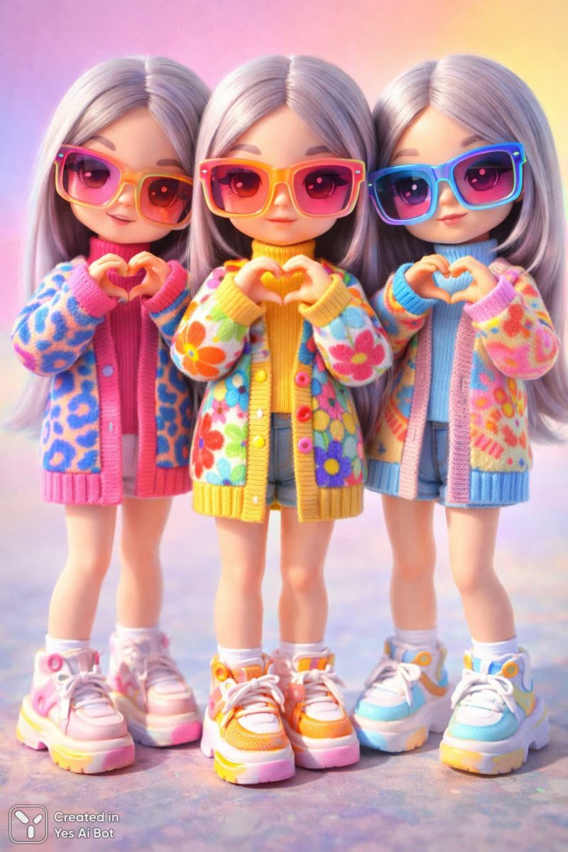 Встречайте очаровательных кукол в ультрамодном стиле! Три стильных персонажа с длинными серыми волосами и невероятно большими яркими очками – воплощение современного тренда. Их образы дополняют красочные леггинсы с оригинальным принтом, уютные кардиганы и теплые водолазки. Завершают ансамбль массивные платформы, добавляющие образу дерзости и индивидуальности. Куклы изображены в игривой позе, демонстрируя милый жест в форме сердца – символ позитива и дружелюбия. Нежный пастельный фон создает мягкую и расслабляющую атмосферу, а яркое и равномерное освещение подчеркивает детали и делает изображение еще более привлекательным. Вся композиция выполнена в милом мультяшном стиле, что придает персонажам особый шарм и очарование. Это идеальное сочетание моды, юмора и нежности, которое обязательно понравится поклонникам ярких и запоминающихся образов. Куклы излучают оптимизм и готовность к новым приключениям, являясь настоящими символами стиля и хорошего настроения. Их внешний вид отражает современные тенденции в моде и дизайне, а игривый характер располагает к себе с первого взгляда. Это прекрасный выбор для тех, кто ценит оригинальность и креативность!