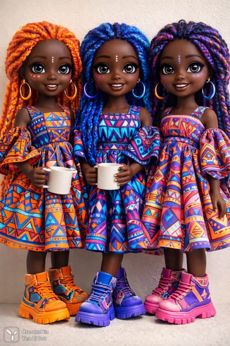 Три африканские куклы с темной кожей и большими выразительными глазами привлекают внимание своим необычным образом. Яркие волосы неоново-оранжевого синего и фиолетового цветов заплетены в сложные косы и собраны в крупные пучки, создавая эффектный контраст с их цветом кожи. Куклы одеты в объемные этнические платья, украшенные геометрическими узорами, которые подчеркивают их культурную принадлежность и добавляют образу динамичности. Завершают ансамбль круглые серьги и замысловатый рисунок на лице, придающие куклам загадочность и уникальность. Необычная массивная обувь является неожиданным акцентом в образе, делая его еще более запоминающимся и привлекательным. Фон нейтральный светлый, что позволяет полностью сосредоточиться на деталях кукол. Мягкое рассеянное освещение создает атмосферу нежности и подчеркивает реалистичность изображения, выполненного в макро-стиле. Каждая деталь проработана с особой тщательностью, позволяя рассмотреть текстуру тканей, узоры на одежде и выражение лиц кукол. Это произведение искусства воплощает красоту африканской культуры и представляет собой уникальное сочетание этнических мотивов и современного дизайна. Использование ярких цветов и необычных деталей делает эти куклы настоящим украшением любого пространства и источником вдохновения для творческих людей. Реалистичность макро-съемки позволяет зрителю ощутить прикосновение к этим удивительным персонажам, погружая в мир фантазии и этнической эстетики