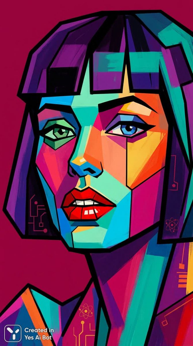 Завораживающий кубистический портрет женщины, выполненный в технике цифровой живописи, представляет собой смелое исследование формы и цвета. Композиция выстроена на принципах минимализма, где лицо модели деконструировано и разбито на геометрические плоскости, каждая из которых окрашена в насыщенные яркие тона. Асимметричные глаза с разным цветом придают портрету загадочность и непредсказуемость, усиливая его визуальный эффект. Губы цвета алого кармина открыты в легкой улыбке, обнажая ряд зубов, что добавляет изображению нотку дерзости и провокации. Четкие черные контуры подчеркивают грани каждой геометрической фигуры, создавая резкий контраст с однотонным фоном насыщенного красно-пурпурного оттенка. Это произведение современного искусства завораживает своей смелостью цветовых решений и деконструкцией традиционного представления о женском портрете, предлагая зрителю новый взгляд на красоту и индивидуальность. Каждая плоскость является самостоятельной единицей, но вместе они образуют гармоничное целое, демонстрирующее мастерство художника в области цифрового искусства и кубизма. Портрет излучает энергию и современность, являясь ярким примером инновационного подхода к изобразительному искусству