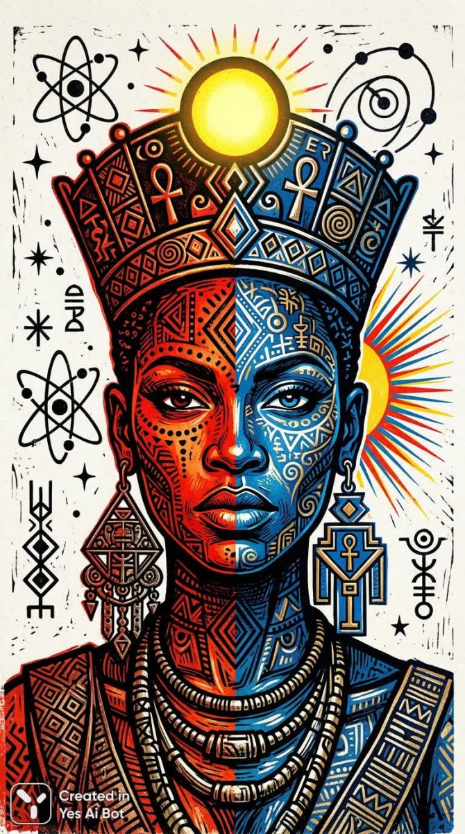 Завораживающий портрет африканской красавицы в ярком линогравюрном стиле. Лицо разделено на две контрастные половины – одну окрашивает насыщенный красный цвет, другую – глубокий синий, создавая эффектную визуальную дихотомию. Над головой возвышается замысловатая корона, украшенная символами, намекающими на мудрость и духовность. Большие геометрические серьги акцентируют внимание на выразительных чертах лица и добавляют портрету динамики. Одежда и кожа покрыты абстрактными узорами, переплетающимися с графичными черными линиями – словно танец света и тени на полотне. Яркое желтое солнце в центре композиции символизирует жизненную энергию и тепло. Фон выполнен в белом цвете, что позволяет выделить красоту и сложность деталей портрета. Вся работа представляет собой гармоничную графическую композицию, где смелые цвета и геометрические формы создают ощущение монументальности и силы. Это изображение – ода африканской культуре, сочетающая традиционные элементы с современным художественным подходом, передающая внутреннюю силу и красоту женщины. Портрет излучает уверенность и загадочность, приковывая взгляд и оставляя неизгладимое впечатление своей оригинальностью и выразительностью. Каждая деталь тщательно продумана, создавая целостное произведение искусства, которое захватывает дух своей энергией и глубиной