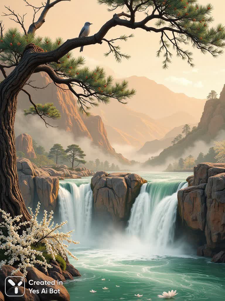A cascading waterfall flows through a vibrant green river, adorned with delicate white blossoms, amidst mountainous terrain painted in warm, earthy tones of ochre and light brown. Gnarled pine branches, laden with small cones and dark green needles, extend gracefully from the upper part of the frame, their texture suggesting rough bark. A tiny gray bird is perched on a branch, adding a subtle element of life. The composition is vertical, emphasizing the height of the landscape and the dynamic flow of water. Soft, atmospheric mist blurs distant hills, creating a sense of depth and serenity. The lighting is gentle and diffused, highlighting the...