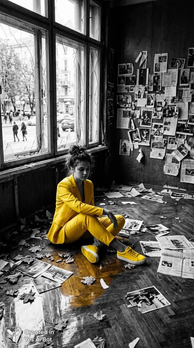 girl in bright yellow suit and yellow sneakers sitting on shiny wooden floor in abandoned room with large broken windows, hair in messy bun, scattered black-and-white photos and newspapers on walls, autumn leaves, reflective floor, strong contrast of yellow and monochrome, wide-angle lens, pensive expression, BG city street through windows, contemporary surreal bw photo