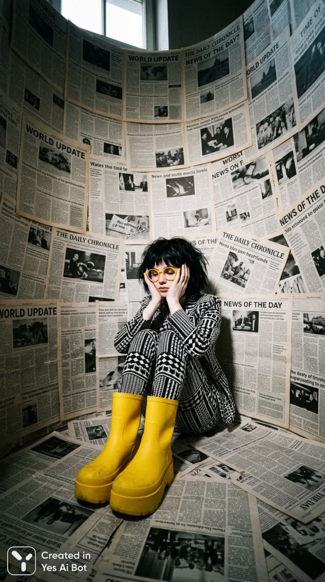 Девушка с короткой черной стрижкой, одетая в костюм черно-белой полоски и яркие желтые очки, восседает в округлой комнате, полностью устланной реалистичными газетами на стенах и полу. Ее ноги обуты в огромные, броские желтые ботинки. Руками она прикрывает лицо, словно испытывая смятение или задумчивость. Камера расположена в углу комнаты, создавая эффектный ракурс, подчеркивающий перспективу и масштаб происходящего. Контраст между ярким, насыщенным желтым цветом и монохромной черно-белой гаммой создает драматический визуальный эффект, притягивающий взгляд и вызывающий ощущение сюрреалистичности. Изображение представляет собой современную фотографию, в которой элементы реальности смешиваются с фантастическими деталями, создавая загадочную и запоминающуюся атмосферу. Комната, наполненная новостями, может символизировать перегруженность информацией или, наоборот, стремление к пониманию окружающего мира. Поза девушки, прикрывающей лицо руками, добавляет в композицию нотку интимности и меланхолии, приглашая зрителя задуматься о ее внутреннем мире и переживаниях. Общее впечатление от фотографии - это сочетание визуального великолепия, интеллектуальной глубины и легкого оттенка абсурда, характерного для сюрреалистического искусства. Это не просто портрет, а скорее зарисовка из сновидения, запечатленная в черно-белых тонах с ярким акцентом на желтый цвет, который словно выделяется из общей картины, притягивая внимание и подчеркивая необычность происходящего