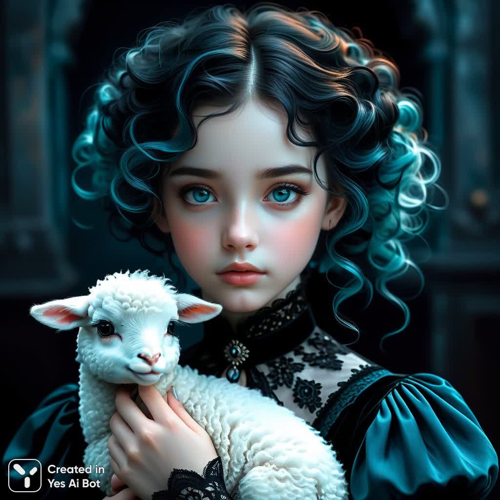 Завораживающая цифровая иллюстрация, пронизанная готическим настроением и мрачной красотой, изображает юную девушку с фарфоровым лицом и печальным выражением в глазах. Ее взгляд полон тоски, а по щекам текут черные, словно чернила, слезы, подчеркивающие трагичность ее образа. Девушка одета в элегантное черное кружевное платье викторианского стиля с высоким воротником, что добавляет ей загадочности и аристократизма. Главная особенность ее внешности – пышные кудри насыщенного темно-бирюзового цвета, словно ночное море, обрамляющие лицо. В руках она нежно держит маленького белоснежного ягненка, символизирующего чистоту и беззащитность, контрастирующего с общей мрачностью сцены. Фон изображения представляет собой глубокую текстурированную темно-сине-черную пустоту, которая создает ощущение бесконечности и одиночества, усиливая эффект загадочности и таинственности. Эта работа в стиле дарк фэнтези поражает своей детализацией и эмоциональной глубиной, погружая зрителя в мир готической меланхолии и трагической красоты, вызывая сильные чувства и заставляя задуматься о хрупкости жизни и неизбежности потерь. Картина завораживает своей мрачной эстетикой и мастерским исполнением, сочетая в себе элементы викторианской эпохи и готического искусства