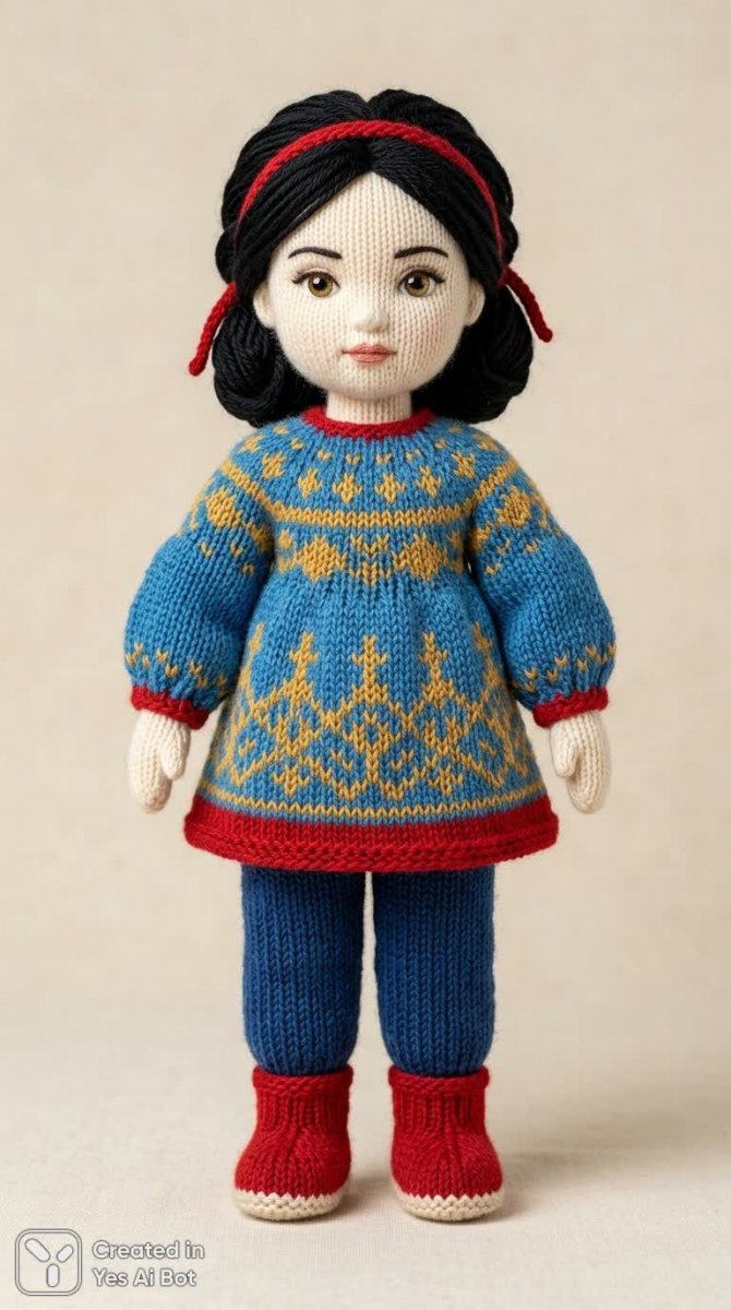 Изящная кукла ручной работы, созданная с любовью крючком, воплощает в себе образ нежной белоснежки. Ее короткие черные волосы обрамляют лицо с большими, лучащимися теплом карими глазами, полными озорства и наивности. Белоснежная кожа контрастирует с ярким и классическим нарядом: голубой лиф идеально сочетается с желтой юбкой высокой талии, подчеркивающей ее стройную фигуру. Пышные рукава добавляют образу легкости и воздушности, а изящная красная лента, перевязанная на талии, акцентирует внимание на тонкой осинке. Маленькие красные туфельки с белыми подошвами завершают ансамбль, придавая ему законченный вид. Кукла запечатлена в статичной позе на нейтральном фоне, что позволяет полностью сосредоточиться на ее деталях и красоте. Высокое качество исполнения и яркий свет подчеркивают насыщенность цветов и мельчайшие нюансы вязаного полотна. Каждая петля крючком проработана с особой тщательностью, создавая ощущение мягкости и тепла. Это не просто игрушка – это произведение искусства, которое способно подарить радость и вдохновение своим обладателям. Белоснежка в исполнении талантливого мастера оживает на наших глазах, наполняя мир волшебством и сказкой. Ее образ вызывает ностальгию по детству и дарит ощущение уюта и тепла. Кукла станет прекрасным подарком для любителей рукоделия, коллекционеров или просто тех, кто ценит красоту и уникальность