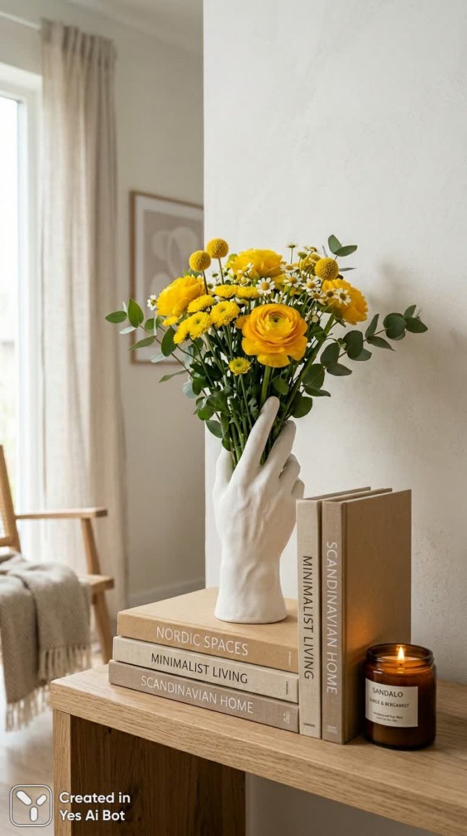 Изящный минималистичный вазон с рельефной текстурой, выполнен в форме руки, бережно удерживающей букет из нежных желтых цветов. Ваза изготовлена из белой керамики и создает ощущение легкости и воздушности. Рядом аккуратно расположены книги в песочном оттенке, добавляющие теплую естественность в композицию. На фоне мерцает ароматная свеча в коричневом стеклянном стакане, наполняя пространство умиротворением и спокойствием. Мягкий дневной свет подчеркивает все детали интерьера, создавая атмосферу гармонии и уюта. Скандинавский стиль проявляется в лаконичности форм и натуральных материалах. Картина выдержана в строгом порядке, демонстрируя безупречный вкус и любовь к деталям. Вид сбоку позволяет оценить всю композицию целиком, подчеркивая ее гармоничность и пропорциональность. Фотореалистичное изображение передает мельчайшие нюансы текстур и оттенков, создавая эффект присутствия и погружая зрителя в атмосферу спокойствия и умиротворения. Эта сцена – воплощение сдержанной элегантности и простоты, где каждый элемент играет свою роль в создании неповторимого образа домашнего очага. Безупречное сочетание цветов и форм создает ощущение гармонии и равновесия, а мягкий свет подчеркивает нежность и хрупкость момента
