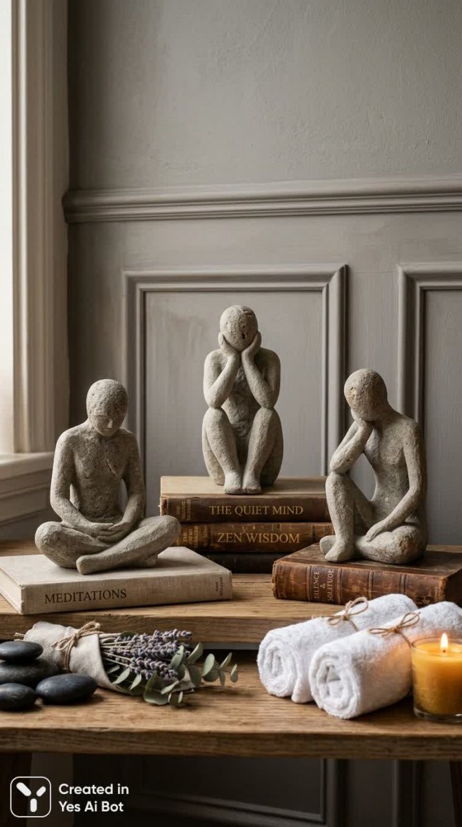 set of three minimalist stone statuettes, seated pensive human figures, varying poses, placed on vintage books, gray wall with classic panels bg, warm soft lighting, decorative stones and rolled white towels nearby, cozy spa atmosphere, high-quality photo