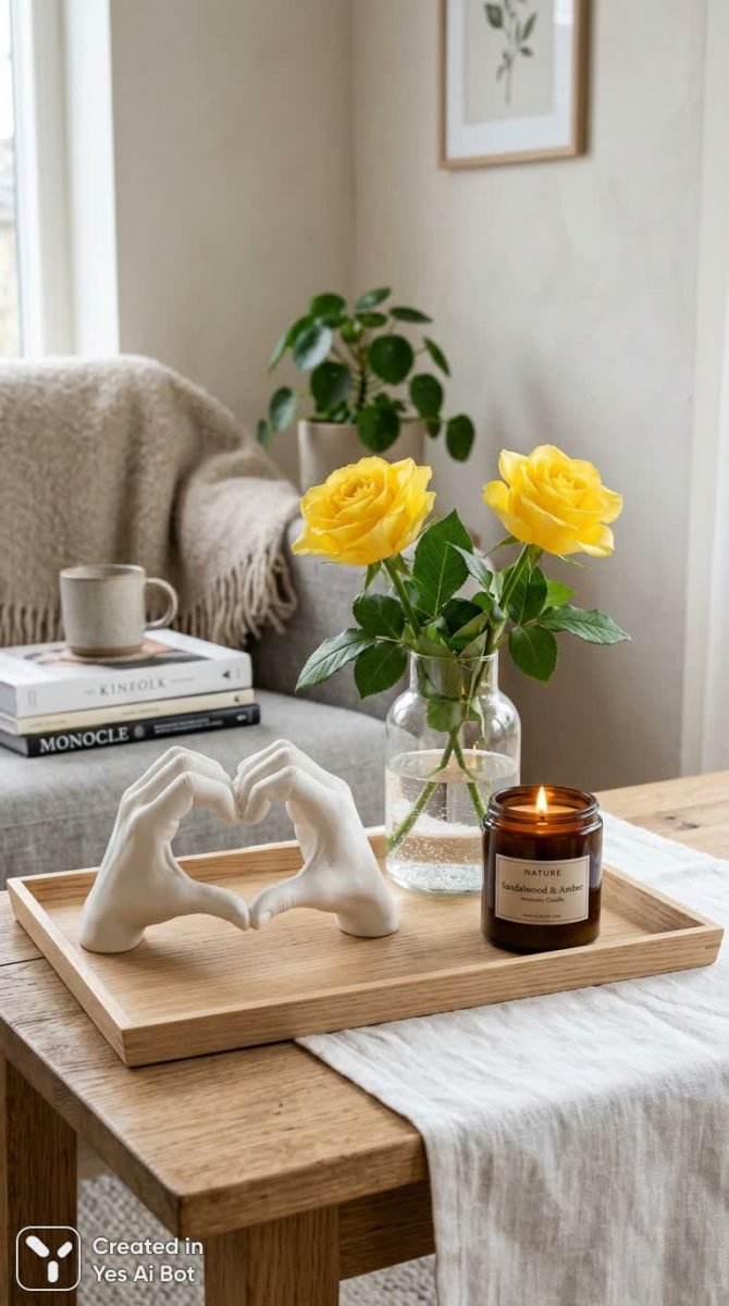 Скандинавский интерьер излучает умиротворение и уют благодаря нежной композиции, где белые керамические руки, соединенные в форме сердца, символизируют любовь и заботу. Прозрачная ваза с двумя желтыми розами и зеленой листвой добавляет тепла, а ароматическая свеча создает расслабляющую атмосферу мягкого света. Все элементы гармонично расположены на светлом деревянном подносе, подчеркивая минималистичный дизайн и нейтральную цветовую гамму бежевых и белых оттенков. Мягкий рассеянный свет окутывает сцену, придавая ей легкость и воздушность, создавая ощущение чистоты и простора. Общий стиль лайфстайл отражает ценности комфорта, гармонии и утонченности, воплощая атмосферу домашнего очага и вдохновения, идеально подходящую для интерьеров в скандинавском или минималистичном стиле. Изображение создано нейросетью Nano Banana v.2.0 в реалистичном и детализированном стиле.