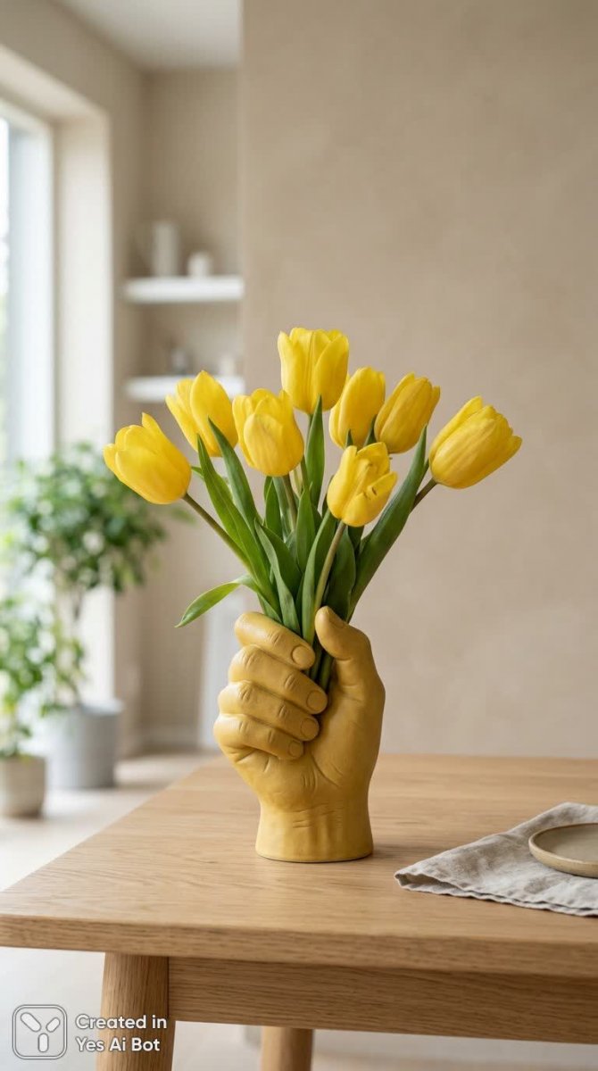 ceramic vase shaped like hand holding yellow tulips, matte yellow ceramic, modern minimalist interior, light wooden table, neutral beige bg, soft daylight illumination, front view, still life style, canon eos r5 lens rf 50mm f1.2l, natural style