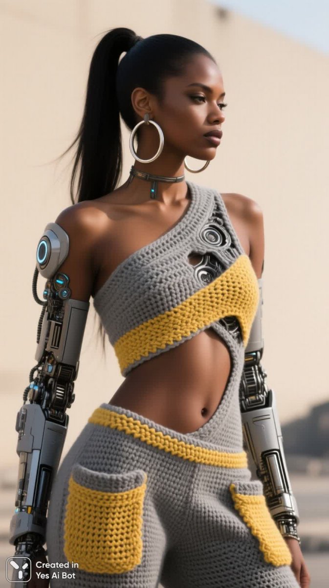 На фотографии изображена темнокожая женщина с высоким конским хвостом, демонстрирующая дерзкий уличный стиль. Её образ состоит из вязаного сета серо-желтого цвета с вырезом на животе и асимметричными карманами, дополненного объемным вязаным воротником ручной работы. Аксессуарами служат крупные кольца в ушах. Общий стиль сочетает элементы гранжа, фэтиш-моды и футуристического шика. Съемка выполнена днем на открытом воздухе с нейтральным бежевым фоном высокого разрешения, что позволяет детально рассмотреть вязаные изделия и подчеркивает естественную красоту модели. Изображение передает уверенность, самовыражение и неповторимый шарм современной женщины, отражая смелое видение моды. Композиция пронизана духом городской эстетики и индивидуальности, создавая запоминающийся визуальный образ. Нейросеть Qwen Images использовала модель QWEN.Basic с сэмплером euler для создания изображения в стилях Biomechanical, Futuristic и Space.
