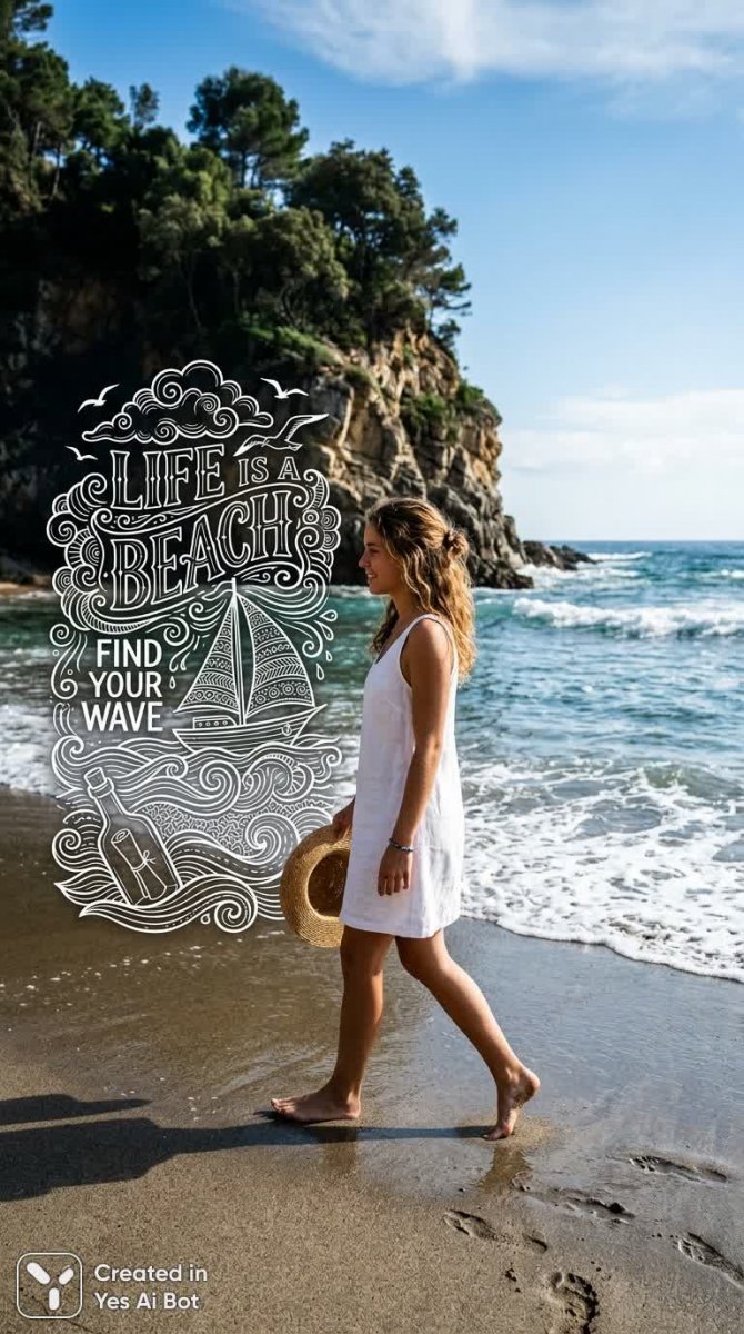 Безмятежная сцена летнего дня на песчаном берегу. Реалистичная девушка идет босиком по теплому песку, ощущая прикосновение мягкого золотистого полотна под ногами. Чистая голубая вода ласково накатывает волнами, создавая умиротворяющий шум и сверкающую игру света на поверхности. Слева возвышается скалистый утес, поросший зеленью деревьев, добавляя пейзажу живописности и природной красоты. Яркое солнце заливает все вокруг теплым светом, подчеркивая детали и создавая ощущение безграничного простора. В композицию органично вплетены простые белые графические элементы – нежные doodle и замысловатые zentangle изображения облаков, чаек и парусника. Среди них выделяется бутылка с письмом, намекающая на тайны, приключения и надежды. Надпись Life is a beach find your wave (Жизнь — это пляж, найди свою волну) призывает к поиску своего пути, гармонии и счастья в окружающем мире. Фотография выполнена со средней точки съемки с боковым видом, что позволяет полностью погрузиться в атмосферу спокойствия и умиротворения. Ручная графика добавляет изображению легкости и индивидуальности. Высокий контраст и темный фон подчеркивают яркость цветов и четкость деталей, делая сцену особенно выразительной и запоминающейся. Это визуальное воплощение мечты об отдыхе на берегу моря, о гармонии с природой и о возможности найти свой собственный путь к счастью. Кажется, что время замерло, позволяя насладиться каждым моментом этого прекрасного дня