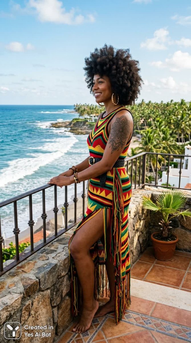 woman on a balcony overlooking the ocean and palm trees, wearing a long colorful crochet fringe dress with geometric patterns in red yellow green and black, deep V-neckline cinched at the waist with a black belt, high slit on the side showing legs, hair styled in an afro, large hoop earrings, tattoo on left arm, bg blue sky and white waves crashing.