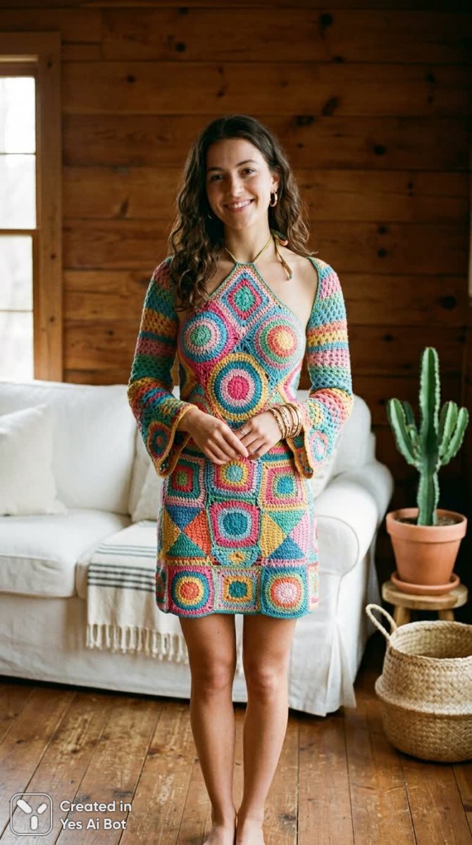 Яркое вязаное платье в стиле бохо и уютная атмосфера домашнего тепла - Генерация в нейросети Nano Banana