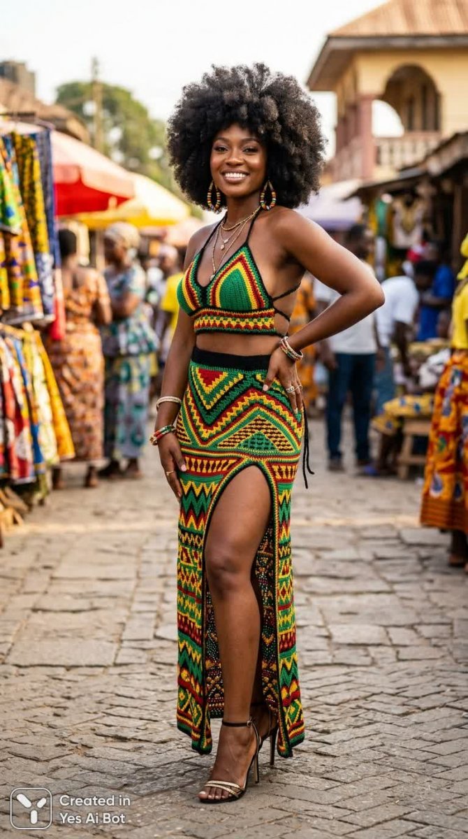 Яркий портрет женщины в аутентичном африканском наряде, воплощающем собой смешение культурных традиций и современного дизайна. В центре внимания – замысловатое вязаное платье крючком, состоящее из длинной юбки с геометрическим узором, насыщенным палитрой зеленых, желтых, красных и черных оттенков. Силуэт подчеркнут вырезом горловины 'лодочкой' с глубоким V-образным декольте и эффектным вырезом на спине, добавляющим образу дерзости и женственности. Прическа – пышная афрошапка, словно корона из темных локонов, гармонично сочетается с яркими красками одежды. Высокий разрез юбки элегантно демонстрирует стройные ноги, а высокие каблуки завершают образ, придавая ему грации и уверенности в себе. Поза модели выражает спокойствие и внутреннюю силу: одна рука покоится на бедрах, другая – на бедре, создавая ощущение расслабленности и естественной красоты. Вся композиция пронизана духом африканского искусства и моды, сочетая в себе традиционные элементы с современными тенденциями. Это не просто фотография, это визуальная история о красоте, культуре и самовыражении, передающая энергию и страсть, присущие африканской душе. Образ излучает позитив и вдохновляет на творчество, являясь настоящим гимном женственности и индивидуальности