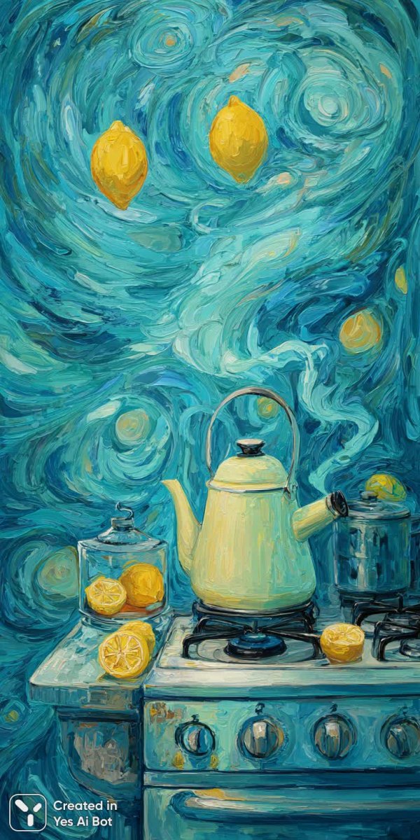 Эмалированный чайник с желто-зелеными лимонами, стоит на газовой плите, изогнутый носик свистит в вихре цвета, синий огонь пляшет под пузатым боком, фон завихрен мазками как на сумасшедшем небе Ван Гога, кухня тонет в золотых и бирюзовых спиралях, все пространство вибрирует от жара и цитрусового аромата, будто чайник крутится в вихре собственных лимонных снов, а пламя поет ему оду