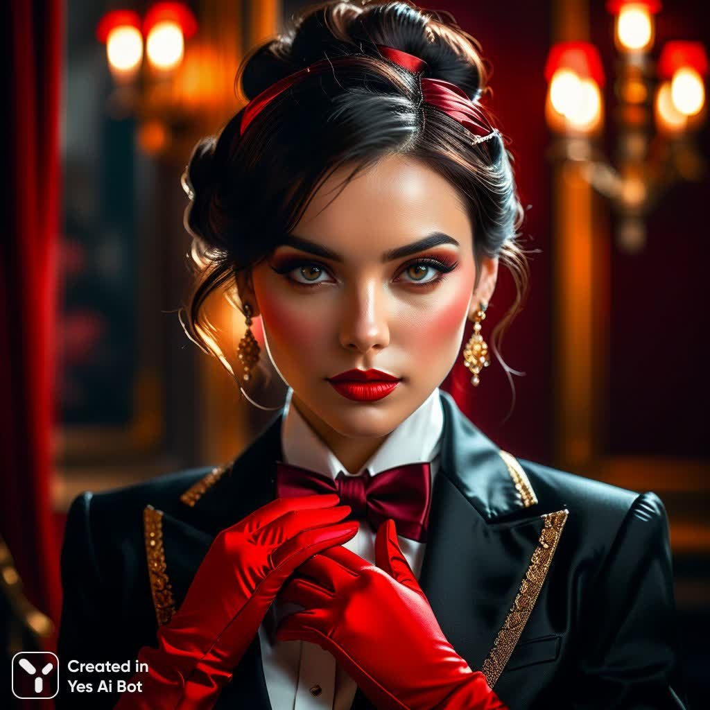 Изысканный портрет женщины в технике акварели и акрила завораживает своей сдержанной элегантностью. Ее темные волосы аккуратно собраны в пучок, а строгий черный блейзер контрастирует с ярким вишневым галстуком-бабочкой, украшенным сложным золотым орнаментом. Тонкие красные перчатки добавляют образу дерзости и привлекательности. Фон выполнен в приглушенных темных тонах, создавая эффект светотени – кьяроскуро, который подчеркивает глубину и драматизм композиции. Ограниченное освещение акцентирует внимание на лице и руках модели, придавая им особое значение. Вся работа пронизана атмосферой классического голливудского гламура, вызывая ассоциации с золотой эрой кино. Монохромная палитра, усиленная яркими акцентами красного и вишневого цветов, создает ощущение утонченности и роскоши. Картина излучает спокойную уверенность и загадочность, заставляя зрителя задуматься о характере и истории этой женщины. Ее образ – это воплощение изысканности и стиля, сочетающее в себе строгость делового костюма и чувственность ярких деталей. Произведение передает атмосферу вневременной красоты и элегантности, оставляя неизгладимое впечатление. Этот портрет – настоящее произведение искусства, способное украсить любой интерьер и стать источником вдохновения для ценителей прекрасного