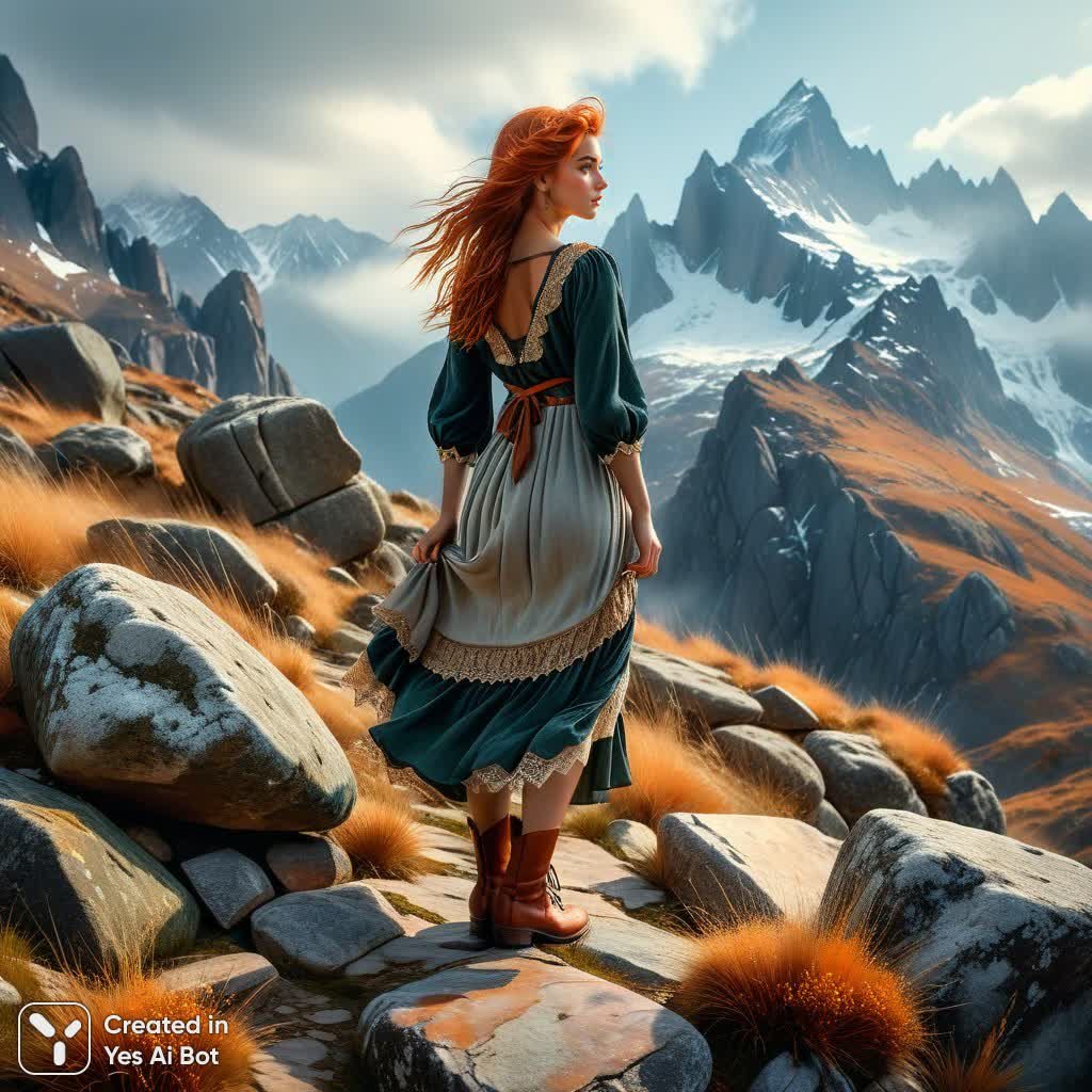 Юная девушка с медными волосами, трепещущими на ветру, застыла на каменистом выступе, крепко прижимая к себе глиняный кувшин. За её спиной возвышается величественная горная цепь, утопающая в легкой дымке. Мягкий и рассеянный свет окутывает сцену, придавая ей ощущение нежности и спокойствия. Вдохновленный стилем предрафаэлитов, рисунок выполнен в приглушенных землистых тонах, создающих гармоничную и умиротворяющую атмосферу. Детализированная одежда девушки – кружевное платье, шерстяные чулки и кожаные туфли – подчеркивает её хрупкость и связь с природой. Каменистая местность, покрытая лишайником, и сухая трава добавляют реализма пейзажу. Выражение лица девушки задумчиво и отрешенно, словно она погружена в свои мысли. Туманные горы на заднем плане усиливают ощущение глубины и простора. Композиция пронизана живописностью и поэтичностью, создавая впечатление запечатленного момента из сказочного мира. Использование акварельных и акриловых техник добавляет изображению легкости и воздушности, а случайная поза девушки придает сцене естественности и непринужденности. Это не просто портрет, это история, рассказанная цветом и светом, о связи человека с природой и красоте окружающего мира. Изображение передает атмосферу спокойствия, созерцания и уединения вдали от городской суеты, погружая зрителя в мир грёз и фантазий