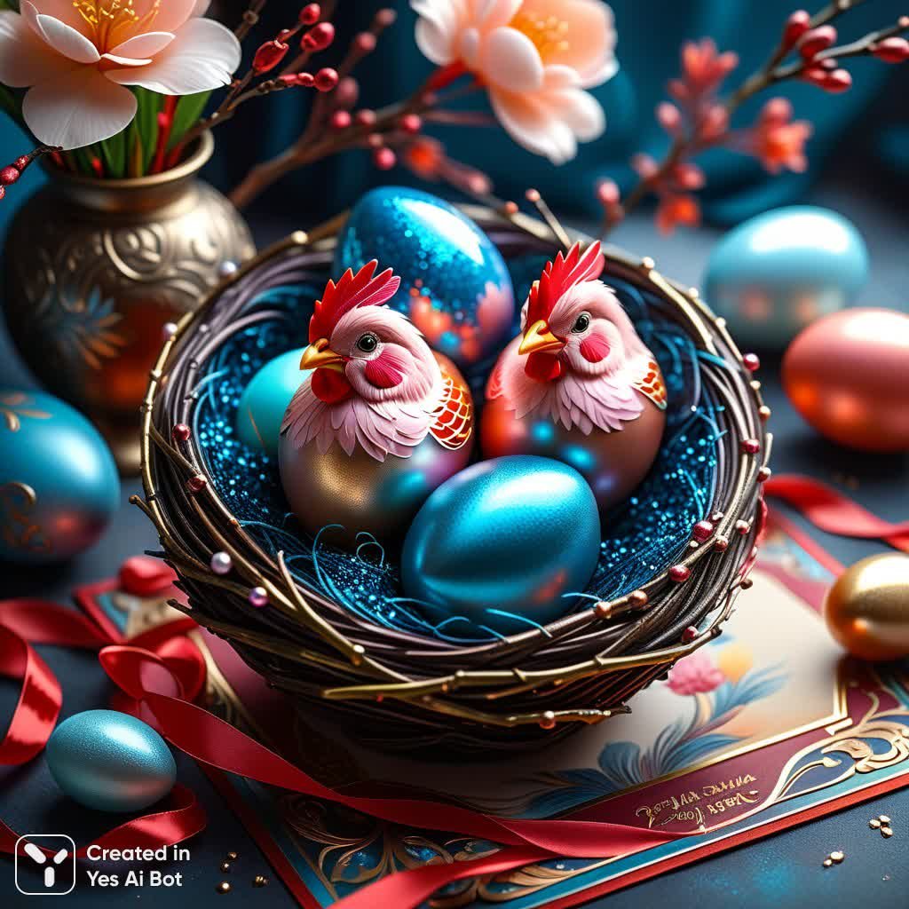 prompt: aristocracy, elegance, glitter fluid art Art Nouveau, Intricacy, (Masterpiece:1.5), (best quality:1.5), Three-dimensional painting, 3D. Easter card, cute nest, it contains red, pink and blue chicken eggs, pearl willow twigs, red silk ribbon, pastel shimmering background.