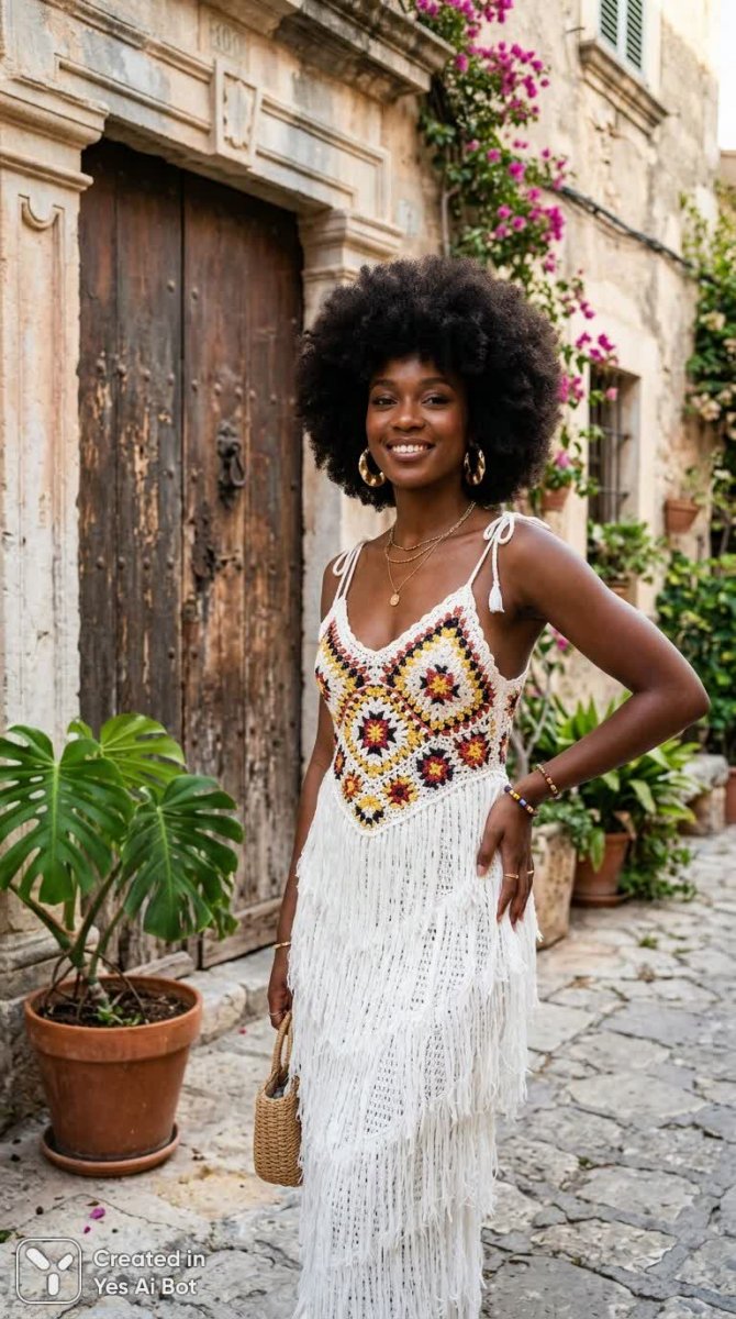 Woman standing in front of a wooden door with a potted plant, wearing a white fringe crochet dress, a colorful pattern in shades of yellow, red, and black. Thin straps that tie at the waist. Large hoop earrings, hair is styled in an afro.