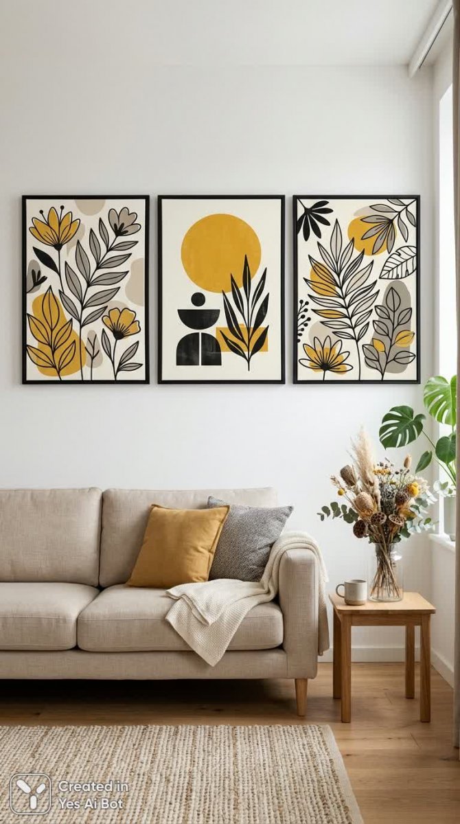 abstract wall art minimalistic gray-yellow palette, graphic flowers contour leaves flat colors black frames on white BG, modern decorative elements for living room, triptych with large circle sun and abstract black shapes, beige sofa foreground wooden side table with glass vase bouquet dried flowers, calm trendy atmosphere, high quality straight on view.