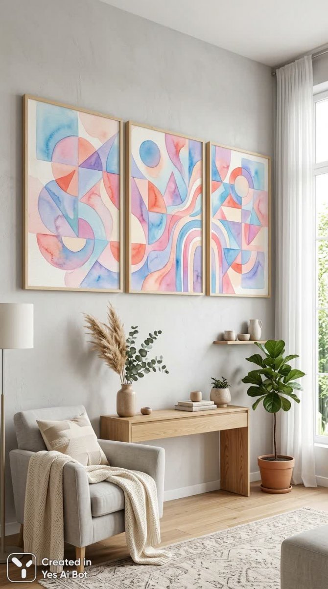 vibrant abstract triptych, bold geometric shapes, pastel blue and pink colors, rendered in watercolor style, soft contours, decorative wall elements for a minimalistic living room, cozy atmosphere, modern decor, light natural daylight filtering through, stylish interior background.