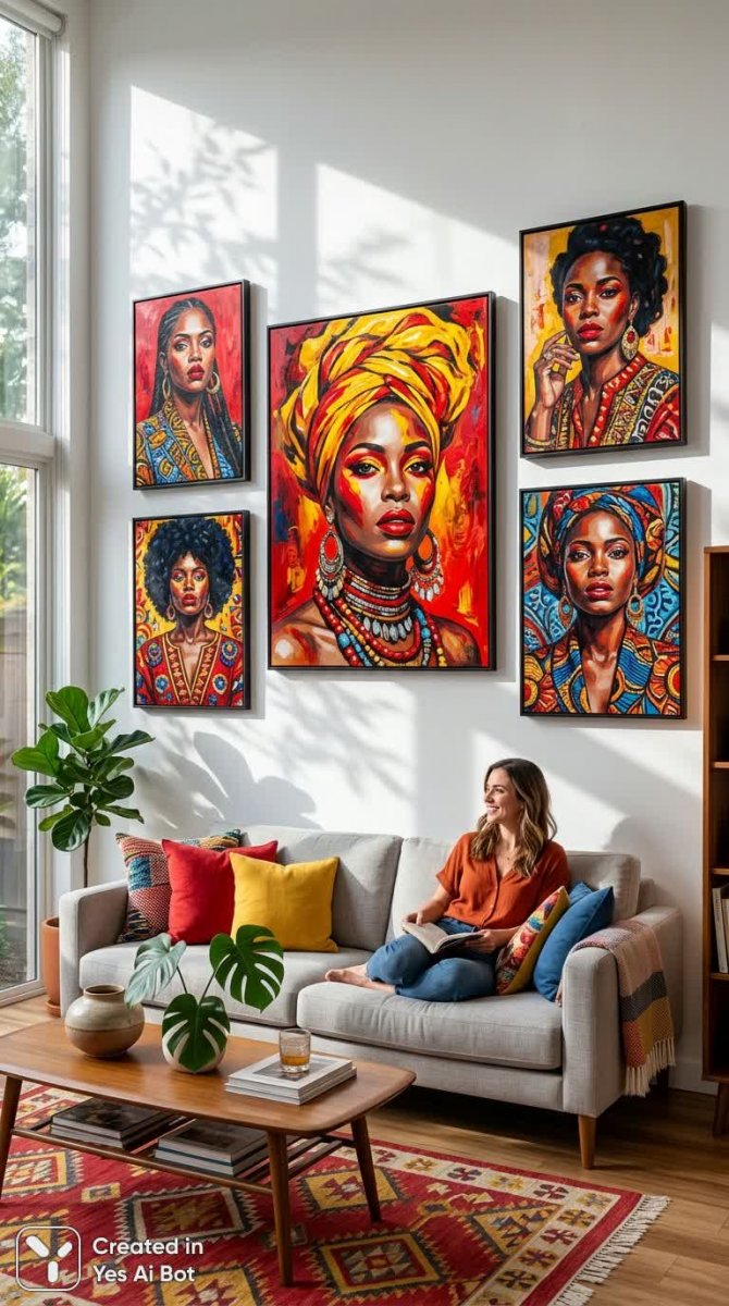 Яркие портреты женщин в современном интерьере: искусство на стенах для стильной гостиной - Пример изображения, созданного ИИ Nano Banana
