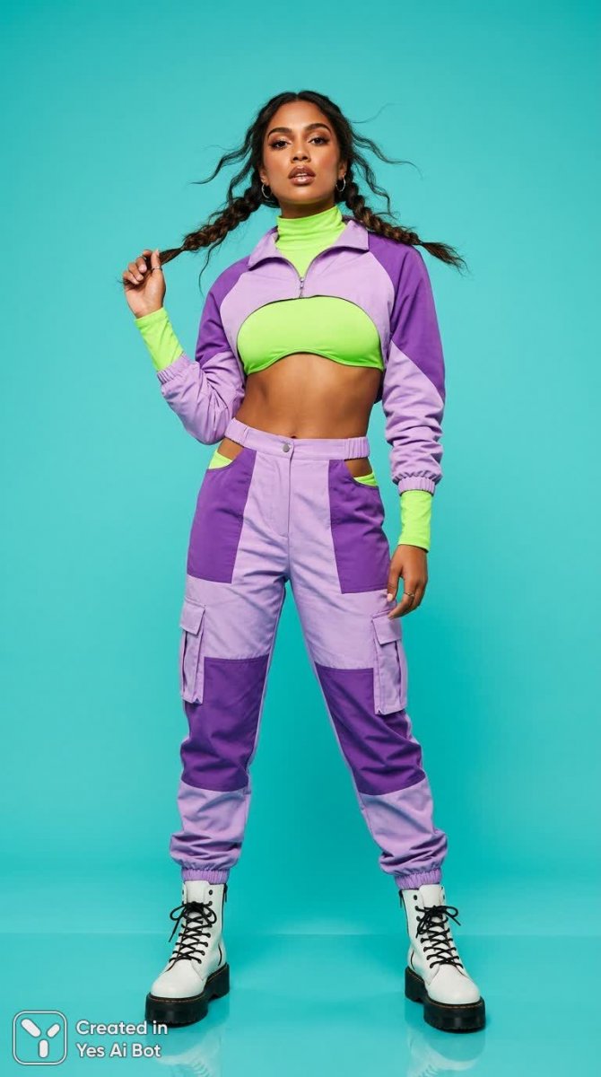 Энергичный комплект для смелых и уверенных в себе девушек сочетает в себе элементы уличной моды и спортивного стиля. Яркая куртка с застежкой-молнией выполнена из блоков лилового и фиолетового цветов, имеет эффектный вырез под грудью и лаконичный крой, подчеркивающий талию. В комплекте идут соответствующие высокие карго джоггеры с модными вырезами на бедрах и функциональными клапанами на карманах. Завершают образ массивные ботинки на платформе в стиле милитари с черной шнуровкой и глубоким протектором, создавая контраст между нежностью цветовой гаммы и дерзостью силуэта. Под курткой виден неоново-зеленый колготник с длинными рукавами, добавляющий динамичности и акцентируя внимание на фигуре модели. Длинные темные волосы, уложенные в две косички с выпущенными прядями, обрамляют лицо и придают образу игривости. Теплый оттенок кожи подчеркивает естественную красоту модели, а слегка растрепанные волосы создают ощущение движения и свободы. Фон выполнен в студийных условиях – гладкий бирюзовый цвет создает идеальный контраст с ярким комплектом одежды и выделяет фигуру на общем фоне. Это воплощение смелости, уверенности и индивидуального стиля