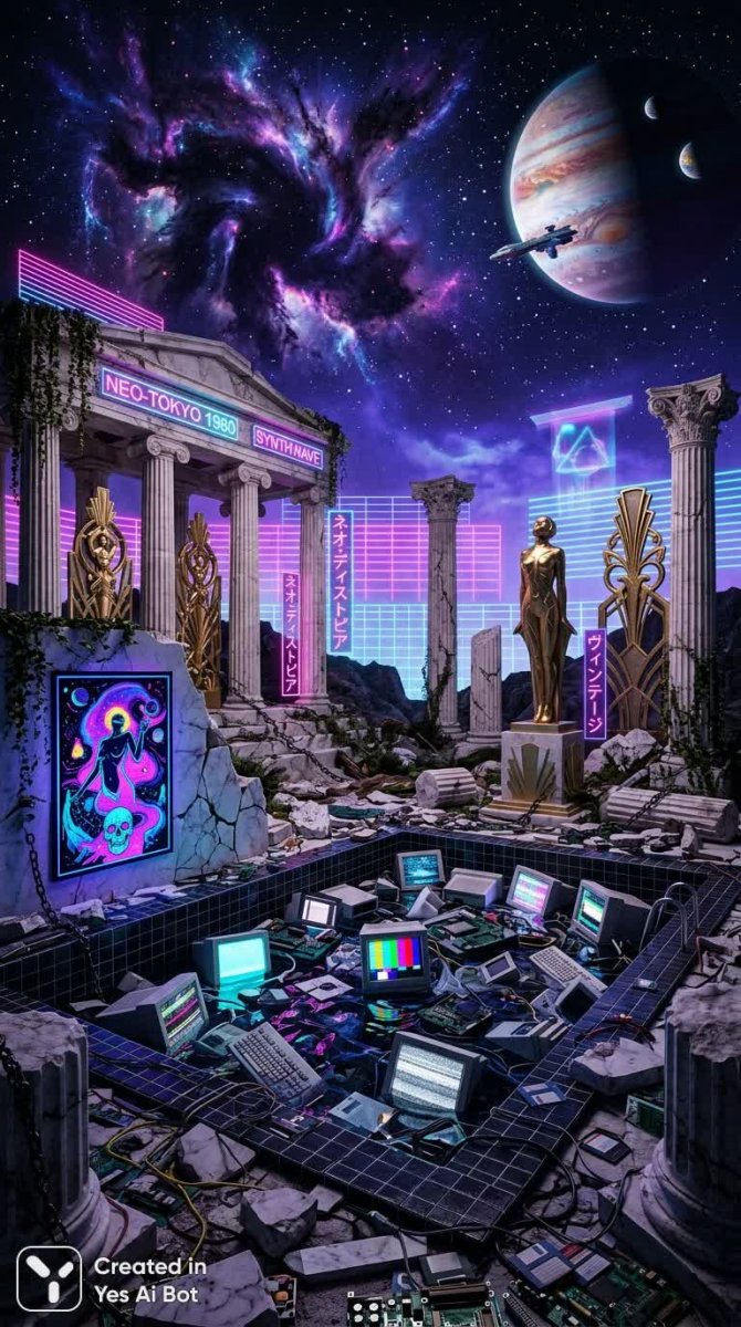 Сюрреалистичная коллажная композиция, выполненная в гиперреалистичной манере, представляет собой завораживающее сочетание различных эпох и стилей. В центре внимания – величественные греческие колонны, гармонично переплетенные с элементами ар-деко скульптуры, создавая ощущение вневременной красоты и утонченности. Неожиданный контраст возникает благодаря бассейну, наполненному винтажным компьютерным оборудованием, символизирующим столкновение аналогового прошлого и цифрового будущего. На заднем плане – яркий акцент в виде черного света, освещающего постер на фоне темного звездного неба, добавляя мистический и загадочный оттенок к общей картине. Разбитые цепи и потрескавшиеся камни намекают на преодоление препятствий и разрушение старых устоев, а масштабная красота цветной планеты и черной космической туманности символизирует бесконечность вселенной и потенциал для новых открытий. Небо окрашено в психоделические оттенки фиолетового и синего, создавая ощущение погружения в трансцендентное состояние. Голографический неон и мерцающие огни добавляют футуристическую атмосферу, а слияние стилей vaporpunk и vaporwave создает уникальную эстетическую палитру, сочетающую в себе ностальгию по прошлому и предвкушение будущего. Эта работа – визуальное путешествие сквозь время и пространство, предлагающее зрителю задуматься о месте человека во вселенной и о взаимосвязи различных культурных эпох. Общая концепция наполнена символизмом, призывающим к исследованию неизведанного и принятию новых перспектив