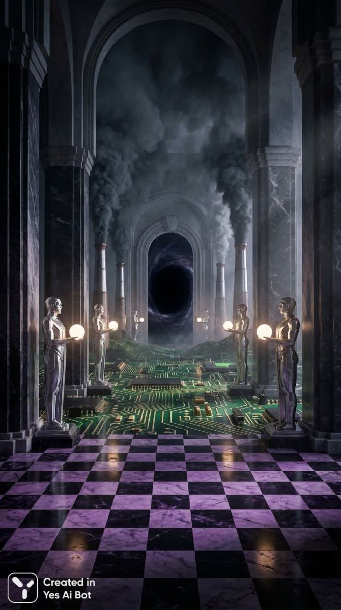 Завораживающая гиперреалистичная фотоколлаж картина, сотканная из неожиданных и противоречивых элементов. В центре внимания – уникальная скульптура в стиле ар-деко, созданная спонтанно, словно выросшая из самой реальности. Величественные мраморные колонны придают сцене монументальность и торжественность, а над ними возвышаются гигантские дымящиеся трубы, намекающие на индустриальную мощь и скрытую опасность. Самым поразительным элементом является инопланетный пейзаж, выполненный в виде компьютерной схемы, расположенный внутри древнего храма. Это странное сочетание технологий и духовности вызывает ощущение нереальности происходящего. В конце арки зияет черный портал – врата в неизведанные миры или отражение потусторонней реальности. Под всем этим великолепием простирается шахматная поверхность, выложенная фиолетовыми и черными клетками, создающая ощущение некой игры или ловушки. Серебряные статуи, словно стражи этого мира, держат в руках светящиеся сферы – источники энергии или символы высшего знания. Вся композиция пронизана атмосферой загадочности, напоминая работы Дэвида Палумбо и Джеймса Жеана, известных своим уникальным стилем и умением сочетать разные художественные направления. Это визуальная поэзия, где прошлое встречается с будущим, реальность переплетается с фантазией, а привычное становится совершенно новым. Картина завораживает своей детализацией и глубиной, заставляя зрителя задуматься о природе реальности и месте человека во вселенной