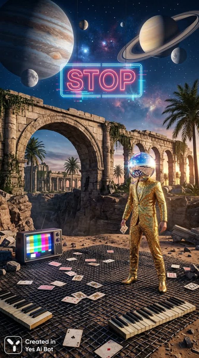 Причудливая коллажная композиция, словно сошедшая с полотна сновидения, объединяет в себе фрагменты различных эпох и стилей. В центре внимания — руины древних построек, обветшалые стены храмов и полуразрушенный каменный мост, символизирующие течение времени и бренность бытия. Экзотические пальмы добавляют ощущение тропического рая, контрастируя с загадочностью архаичных строений. Неожиданным элементом является голова человека в золотом костюме, украшенная сверкающим диско-шаром – яркий символ эпохи ретро и гламура. Рядом расположен старинный телевизор, намекающий на ностальгию по ушедшим временам, а разбросанные клавиши пианино и игральные карты создают атмосферу случайности и беззаботности, словно застывшие в моменте игры. Все это великолепие покоится на черной металлической сетке, добавляя ощущение хрупкости и нестабильности происходящего. Яркий голографический неоновый знак 'стоп' призывает к размышлению о контроле и предопределенности в этом хаотичном мире. На фоне всего этого великолепия простирается голубое небо, усыпанное планетами, расширяя границы восприятия и намекая на космические масштабы происходящего. Вся композиция пронизана эстетикой вейпорвейва – направления, сочетающего в себе элементы ретрофутуризма, научной фантастики и ностальгии по аналоговому миру, создавая неповторимую атмосферу загадочности и меланхолии. Это визуальное путешествие сквозь время и пространство, где прошлое встречается с будущим, а реальность переплетается с иллюзией. Каждая деталь этого коллажа несет в себе скрытый смысл, приглашая зрителя к интерпретации и разгадке тайны