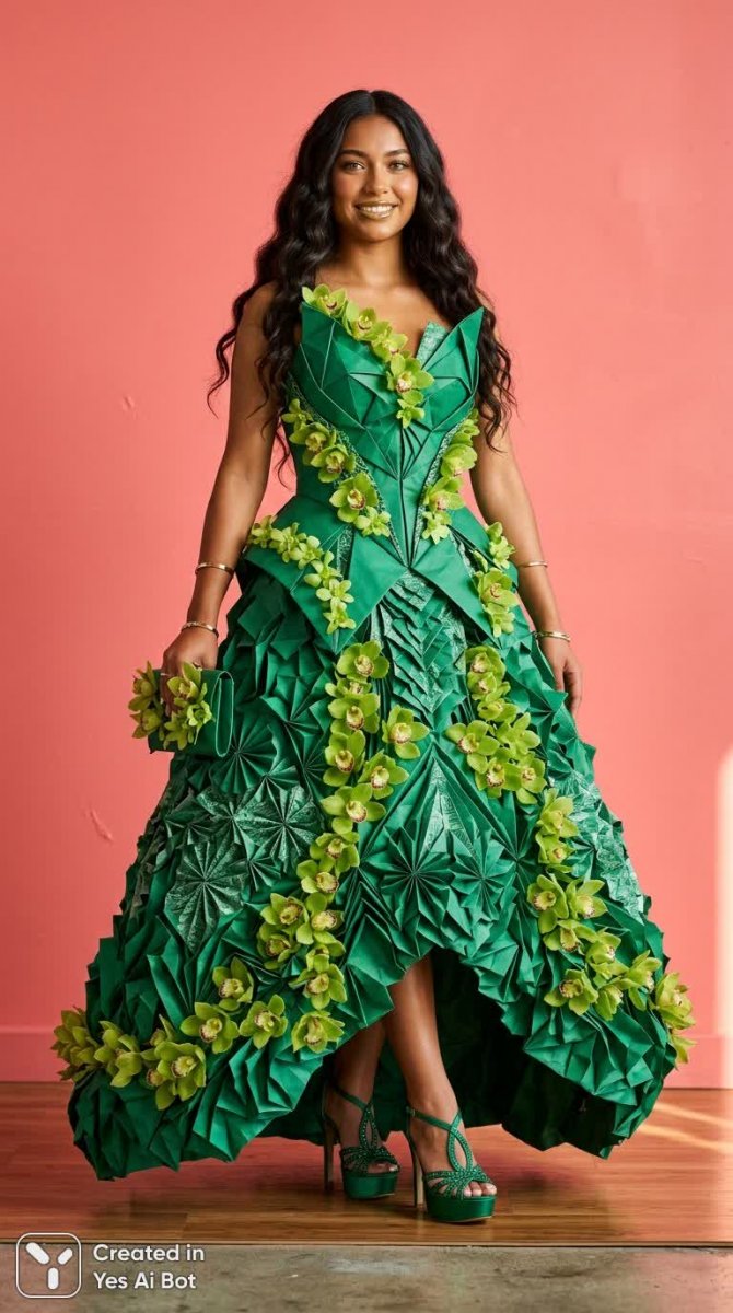 Очарование в изумрудном платье из бумаги и орхидей - Пример изображения, созданного ИИ NanoBanana