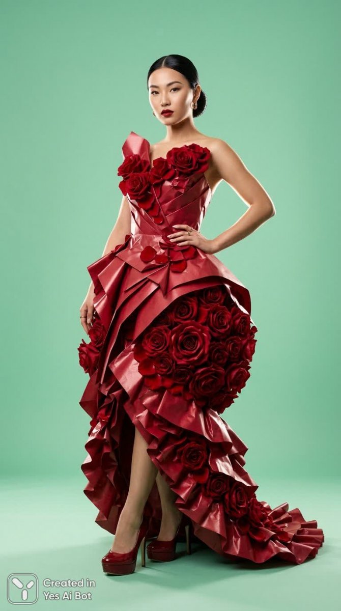 young woman east asian, dark brown eyes, jet black hair in sleek low bun, wearing dress made of glossy crimson wrapping paper and deep red roses, high heel and platform shoes in matching deep red, pure background color mint green, dramatic rim lighting, editorial fashion pose with one hand on hip, matte red lipstick, textured paper folds and realistic petal detail, studio photography, high resolution, high fashion.