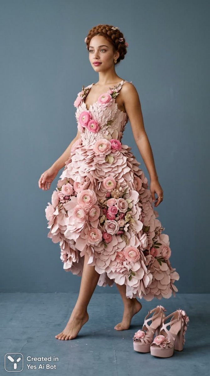Изображение демонстрирует нежную красоту молодой женщины смешанной расы с каштановыми волосами, собранными в косу-корону и медовыми глазами. Она одета в платье из переработанной розовой бумаги, украшенное бутонами розовых ранункулюсов, создавая впечатление воздушности и невесомости. Туфли в том же приглушённом розовом оттенке с высоким каблуком и платформой дополняют образ, а вырезы в платформе обнажают ступни, добавляя игривости. Фон выполнен в спокойных серо-голубых тонах, акцентируя внимание на модели и деталях наряда. Мягкий естественный свет подчёркивает изысканность каждого элемента, а нежно-розовый блеск для губ завершает романтический образ. Картина выполнена в стиле реализма с высокой детализацией, создавая ощущение гармонии, лёгкости и запечатлённого момента красоты и грации. Использование нейросети Nano Banana v.2.0 позволило создать визуально привлекательное произведение искусства, сочетающее в себе элементы 3D-графики и детальную проработку текстур бумаги и цветов. Общий эффект – поэтическое воплощение природной красоты и хрупкости, словно сотканное из утренней дымки.