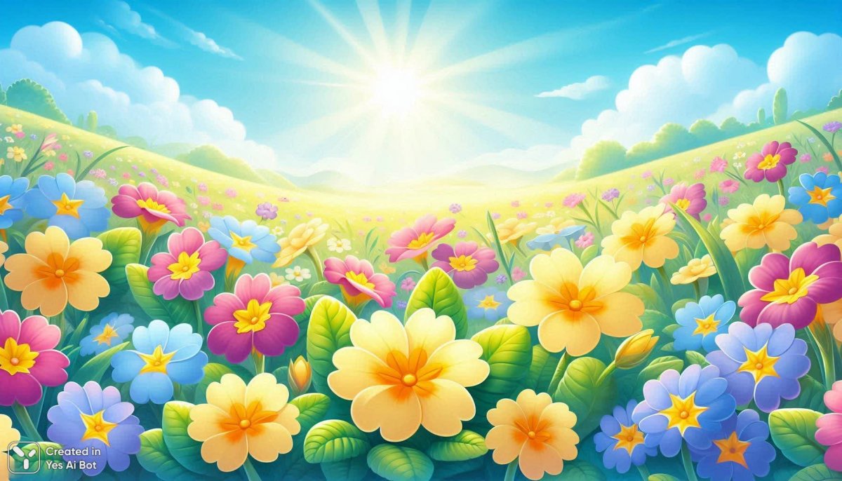 Изобрази раннюю весну, распускаются цветки первоцвета весеннего primula veris, вокруг радостная атмосфера возвращения тепла, синее небо, очень солнечный день.