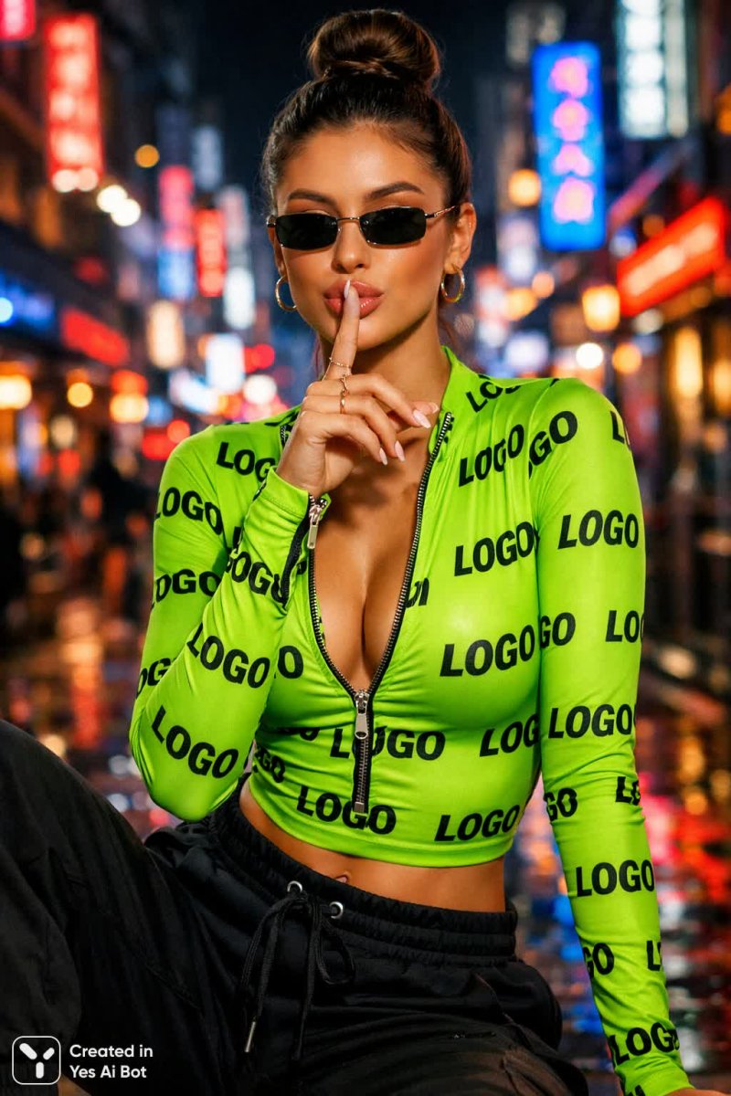 Яркий и дерзкий образ современной городской модницы. В центре внимания – облегающий боди с молнией по всей длине и смелым вырезом в форме буквы V, украшенный неоново-зеленым логотипом. Боди подчеркивает стройную фигуру и атлетичные формы модели, создавая эффектный силуэт. В сочетании с ним – стильные черные джогеры с низкой посадкой, идеально дополняющие спортивный стиль ансамбля. Завершают образ аккуратный пучок на макушке, изящные золотые серьги-кольца и тонкие прямоугольные солнцезащитные очки. Макияж выполнен в нежных тонах: легкий контуринг, длинные ресницы и глянцевые губы придают лицу свежесть и выразительность. Руки модели ухожены – аккуратный маникюр с бледно-розовым лаком и деликатные кольца подчеркивают женственность образа. В финальной детали - легкое прикосновение пальца к губам в жесте 'тише', создающее атмосферу загадочности и соблазна. Фоном служит оживленная городская ночь с яркими неоновыми вывесками, добавляющими динамики и энергии всему снимку. Высокий динамический диапазон позволяет передать все богатство деталей и цветов ночного города, создавая эффектное визуальное впечатление от всей композиции. Этот образ – воплощение современной моды, сочетающей в себе спортивный стиль, элегантность и дерзкую индивидуальность